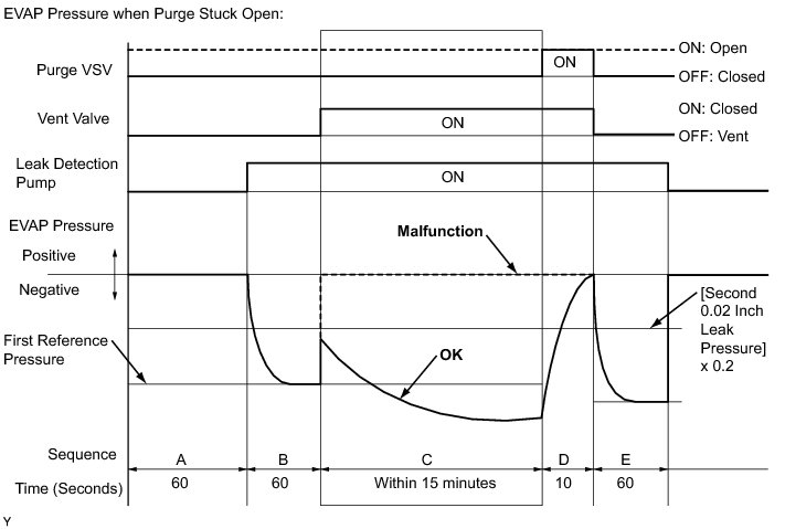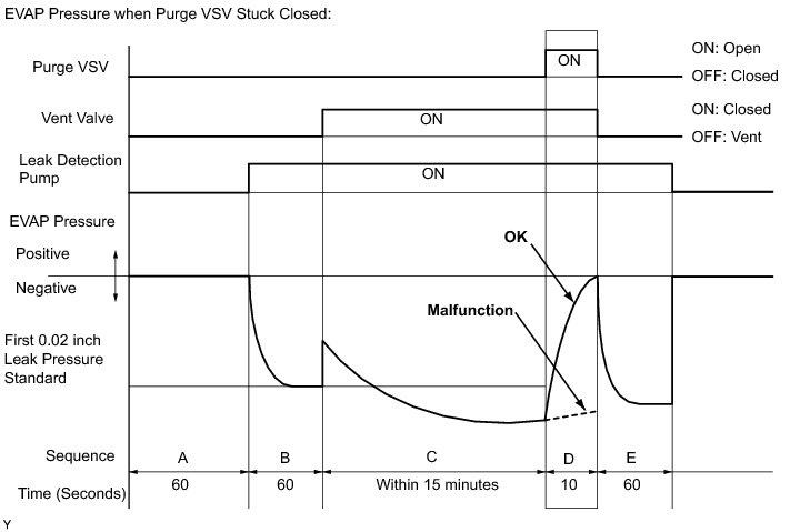 In operation C, the leak detection pump creates negative pressure (vacuum) in the EVAP (Evaporative Emission) system. The EVAP system pressure is then measured by the ECM using the canister pressure sensor. If the stabilized system pressure is higher than [second 0.02 inch leak pressure standard x 0.2], the ECM interprets this as the purge VSV being stuck open. The ECM illuminates the MIL and sets the DTC (2 trip detection logic).