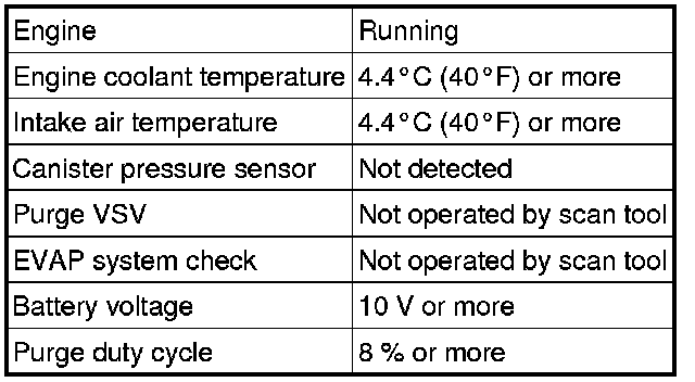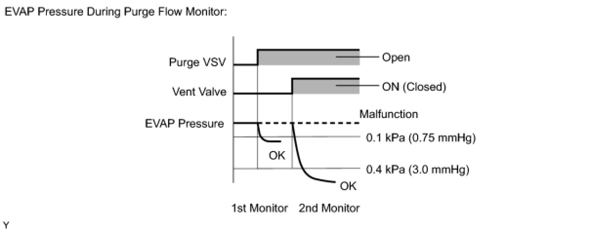 While the engine is running and the purge VSV is on (open), the ECM monitors the purge flow by measuring the EVAP pressure change. If negative pressure is not created, the ECM begins the 2nd monitor.