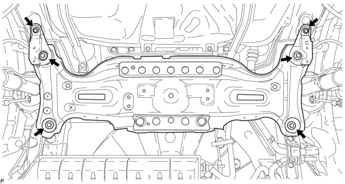 * To prevent the rear suspension member sub-assembly from falling after removing the rear suspension member body mounting front cushion LH, support the rear suspension member sub-assembly using your hands and body while pressing.