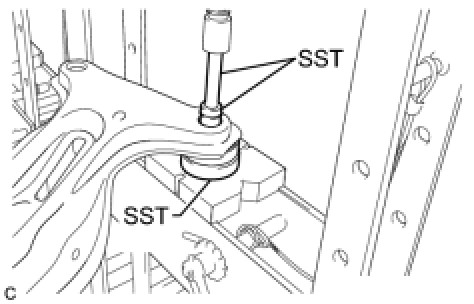 (a) Using SST and a press, remove the rear suspension member body mounting front cushion LH from the rear suspension member sub-assembly.