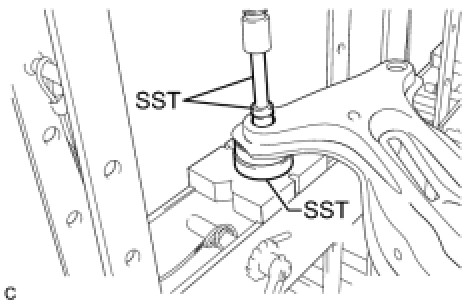 * To prevent the rear suspension member sub-assembly from falling after removing the rear suspension member body mounting rear cushion, support the rear suspension member sub-assembly using your hands and body while pressing.