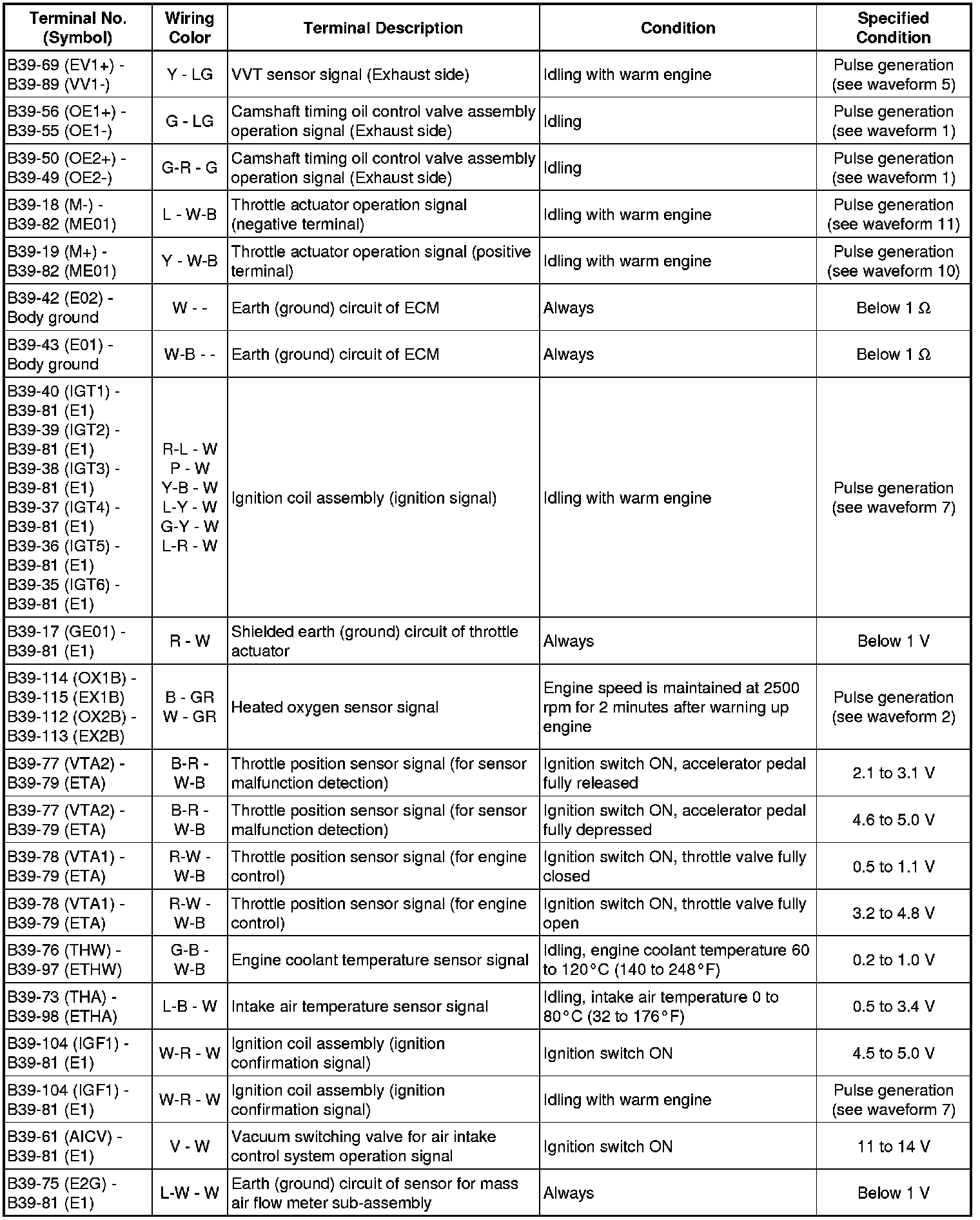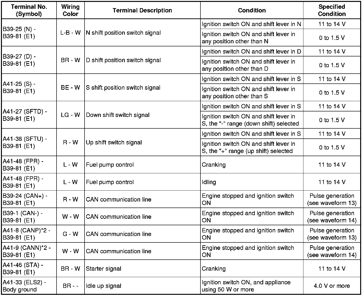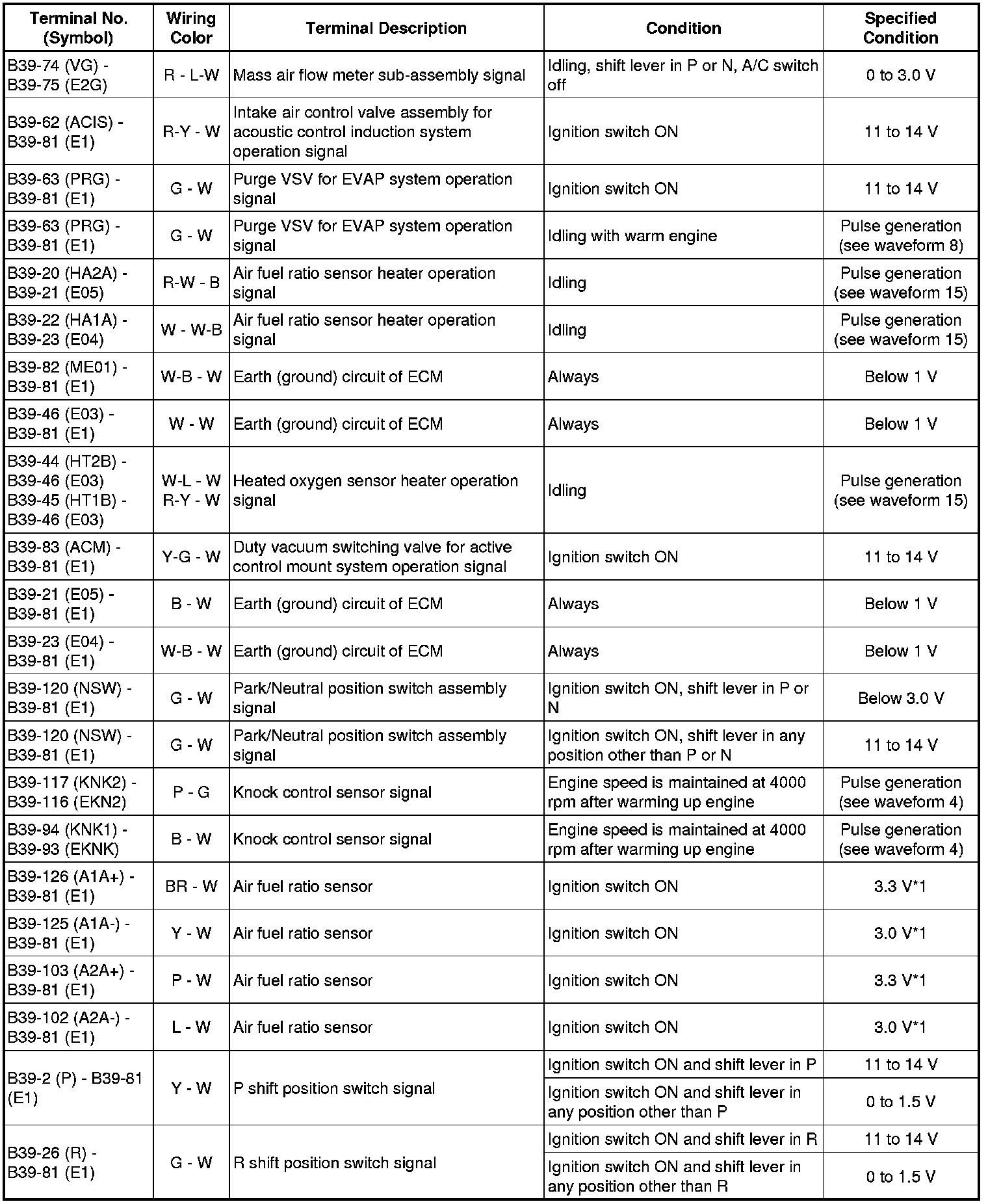 The standard normal voltage between each pair of the ECM terminals is shown in the table below. The appropriate conditions for checking each pair of the terminals are also indicated.