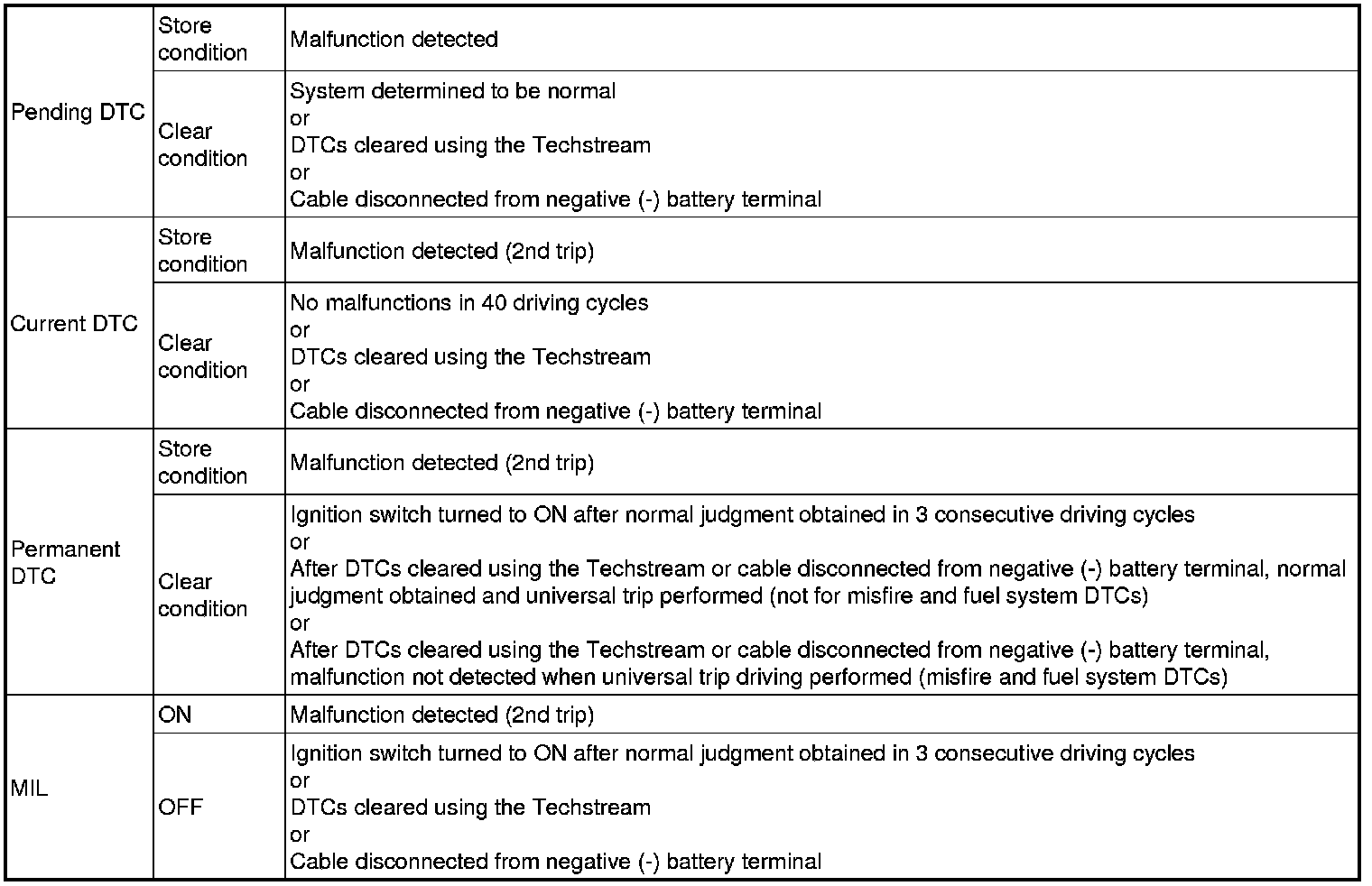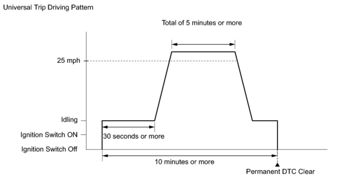 * After clearing current DTCs using the Techstream or by disconnecting the cable from the negative (-) battery terminal, permanent DTCs can be cleared when the system is determined to be normal for the relevant DTCs and then the universal trip is performed. The driving pattern to obtain a normal judgment is described under the "CONFIRMATION DRIVING PATTERN" for the respective DTC.