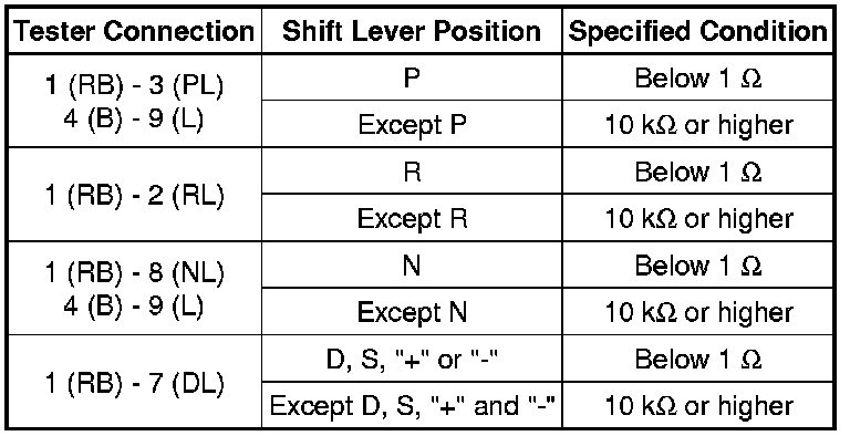 (a) Measure the resistance according to the value(s) in the table below when the shift lever is moved to each position.