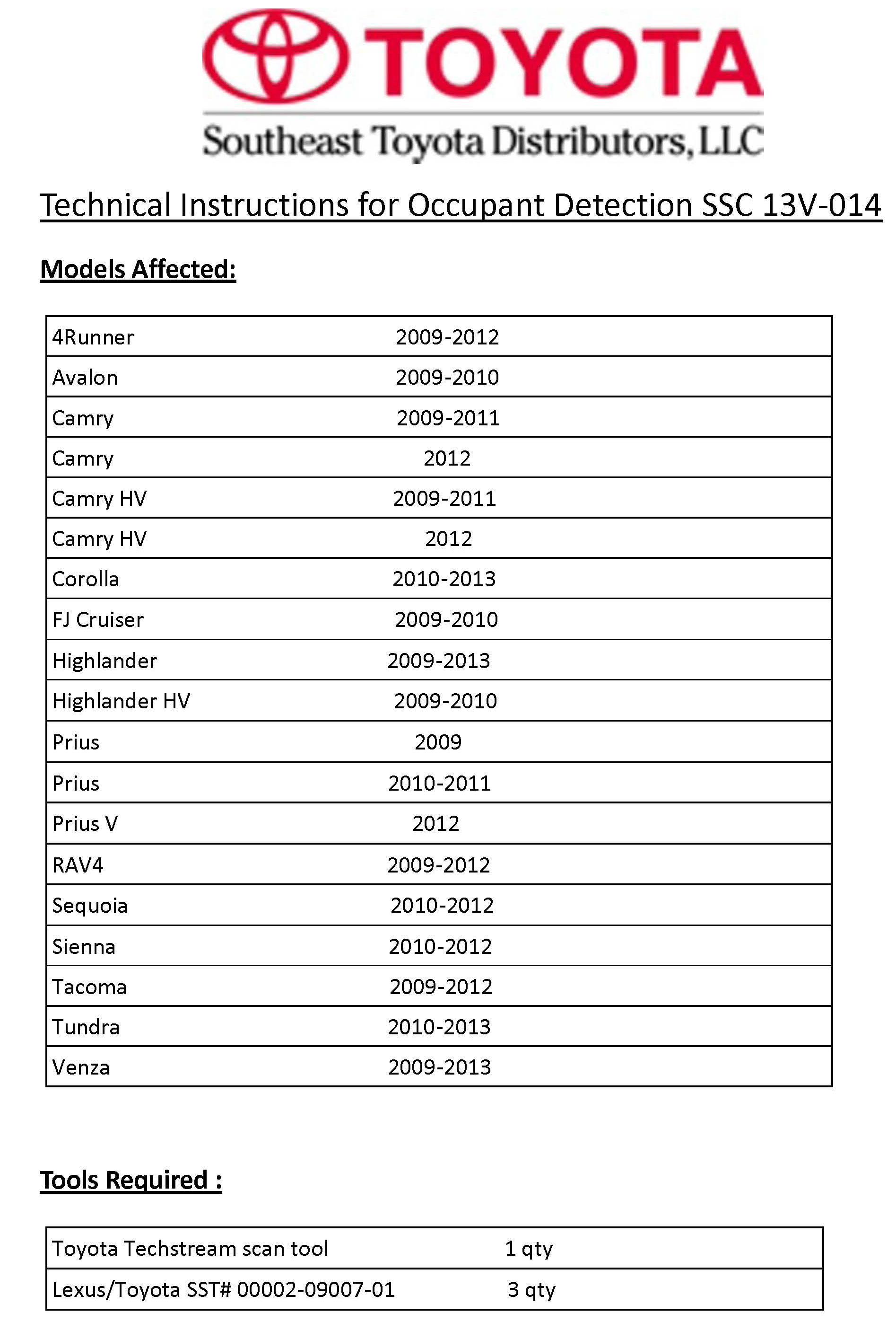 Technical Instructions For Occupant Detection SSC-13V-014