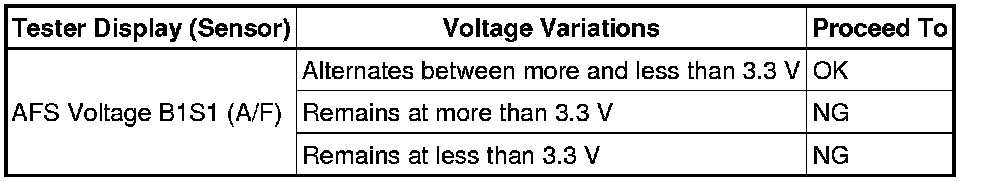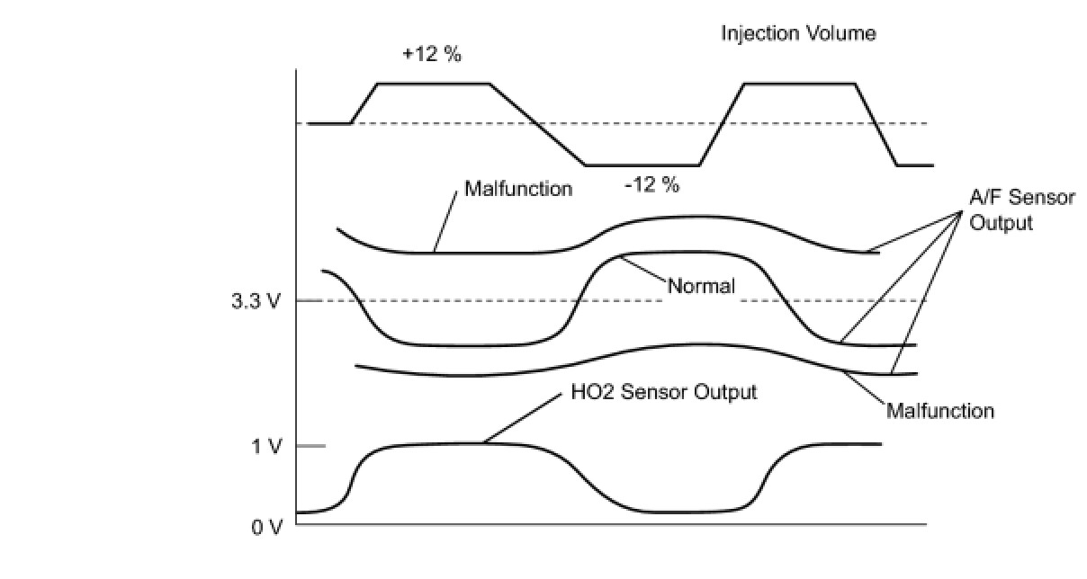 A normal HO2 sensor voltage (O2S B1S2) reacts in accordance with increases and decreases in fuel injection volumes. When the A/F sensor voltage remains at either less or more than 3.3 V despite the HO2 sensor indicating a normal reaction, the A/F sensor is malfunctioning.