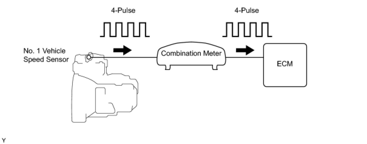The vehicle speed is detected using the No. 1 vehicle speed sensor. The No. 1 vehicle speed sensor transmits a 4-pulse signal for every revolution of the rotor shaft, which is rotated by the transaxle output shaft via the driven gear. The 4-pulse signal is converted into a more precise rectangular waveform by the waveform shaping circuit inside the combination meter. The signal is then transmitted to the ECM. The ECM determines the vehicle speed based on the frequency of the pulse signal.