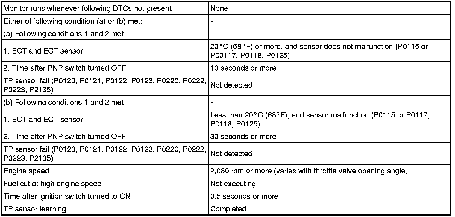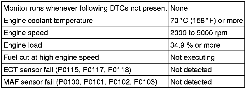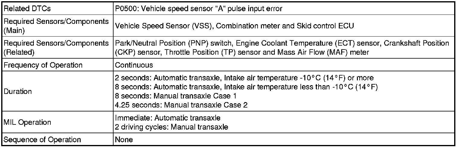The ECM assumes that the vehicle is being driven, when the indicated engine speed is more than 2080 rpm and 30 seconds have elapsed since the Park/Neutral Position (PNP) switch was turned OFF (typical example values). If there is no speed signal from the combination meter, despite these conditions being met, the ECM interprets this as a malfunction in the speed signal circuit. The ECM then illuminates the MIL and sets the DTC.