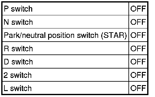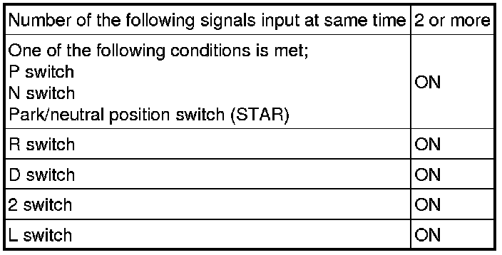 The park/neutral position switch sends a signal to the ECM according to the shift position (P, R, N, D, 2 or L). The ECM determines that there is a problem with the switch or related parts if it receives 2 or more position signals simultaneously or it receives no position signal. The ECM turns on the MIL and stores the DTC.