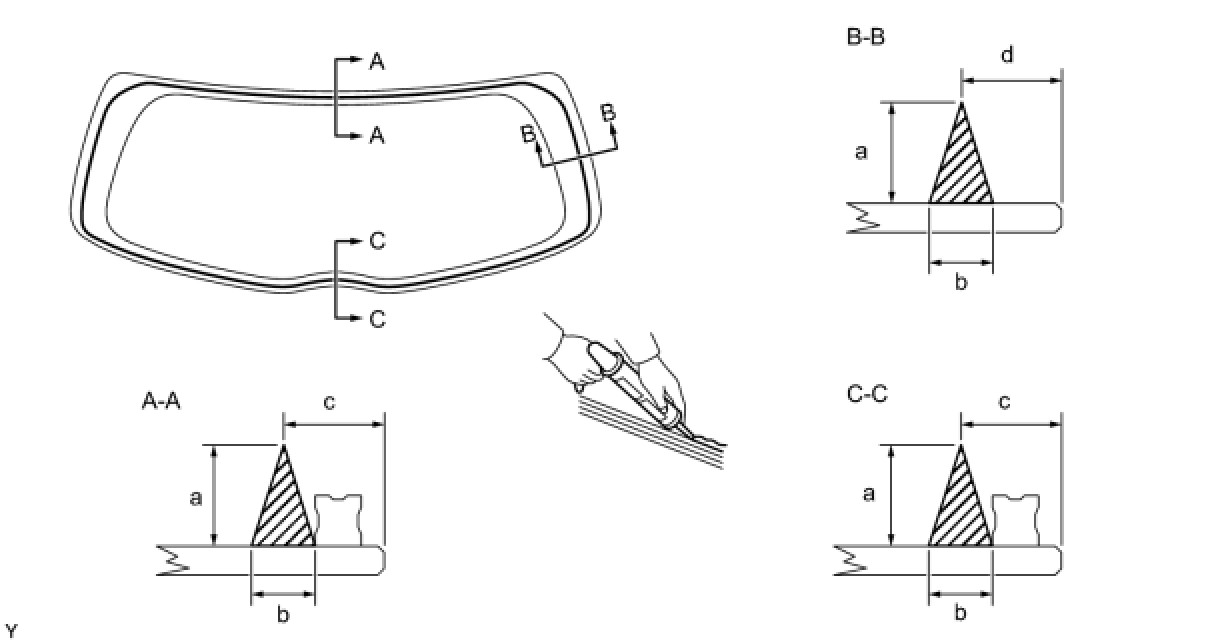 (b) Install 2 new back door glass adhesive dams as shown in the illustration.