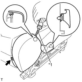 (b) Using a screwdriver with its tip wrapped in protective tape, disengage the claw and the clip and remove the front seat cushion outer shield.