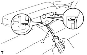 (b) Using a screwdriver with its tip wrapped in protective tape, disengage the 2 claws and the clip and remove the front seat cushion outer shield.