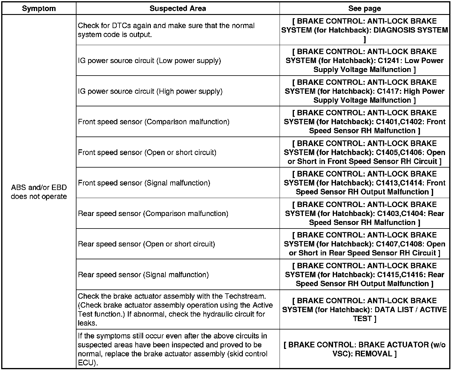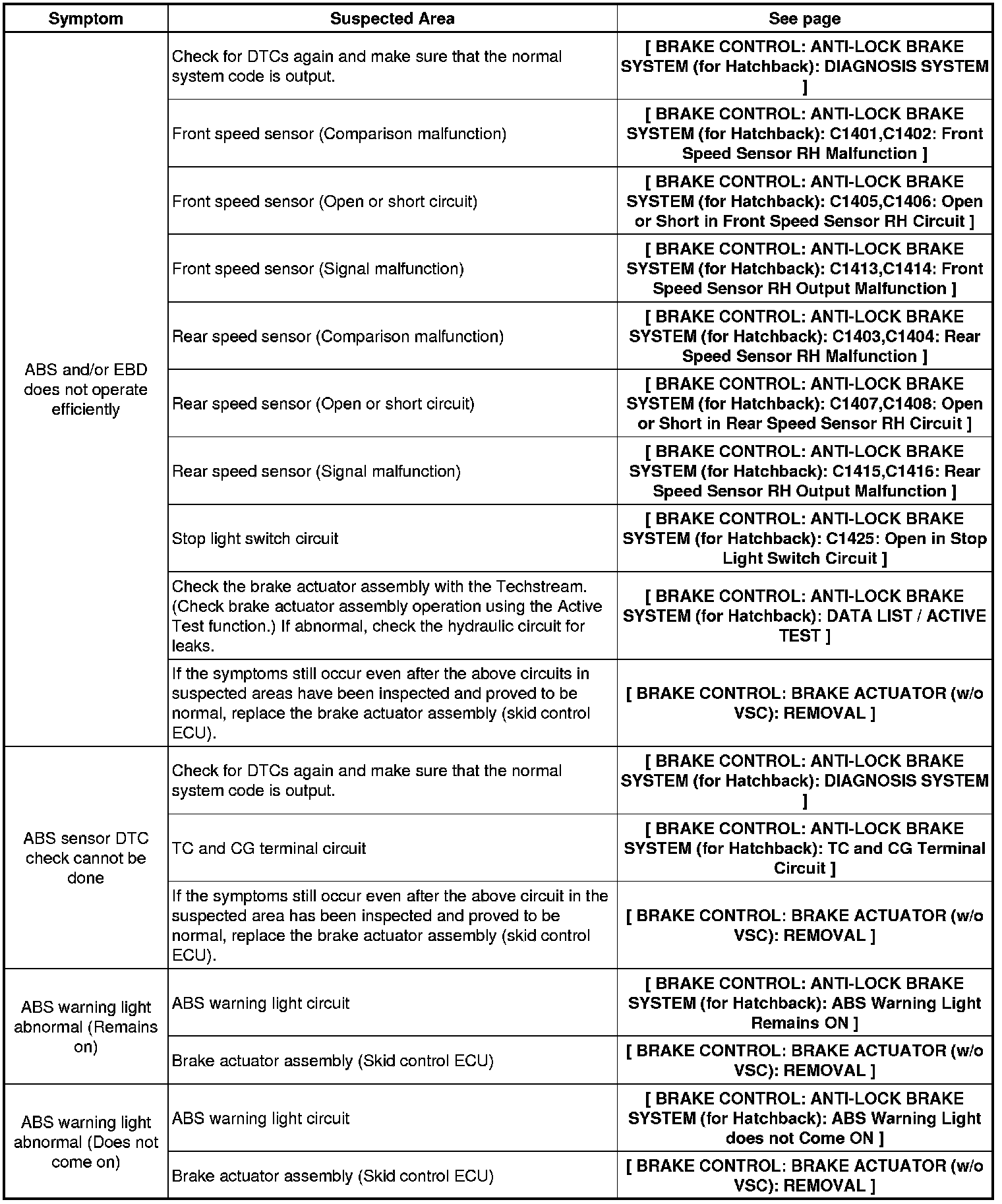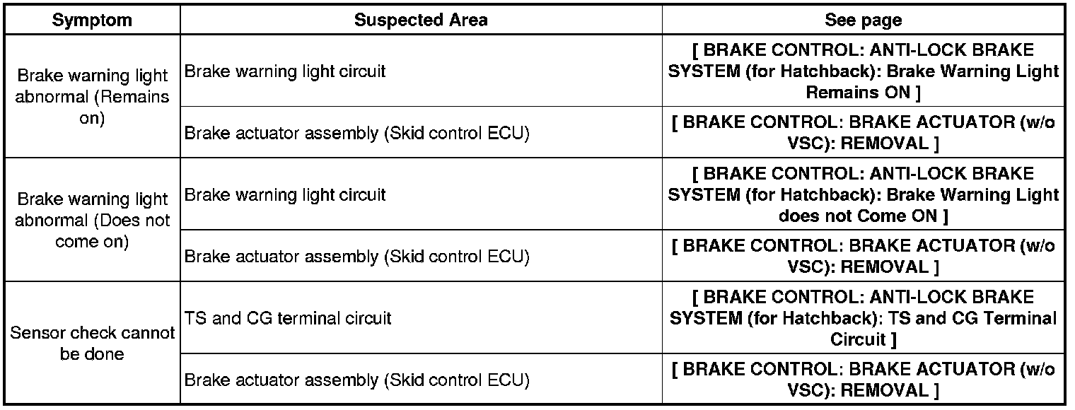 BRAKE CONTROL: ANTI-LOCK BRAKE SYSTEM (for Hatchback): PROBLEM SYMPTOMS TABLE