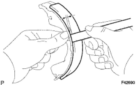(b) If the lining thickness is equal to or less than the minimum value, or if there is any severe or uneven wear, replace the brake shoe.