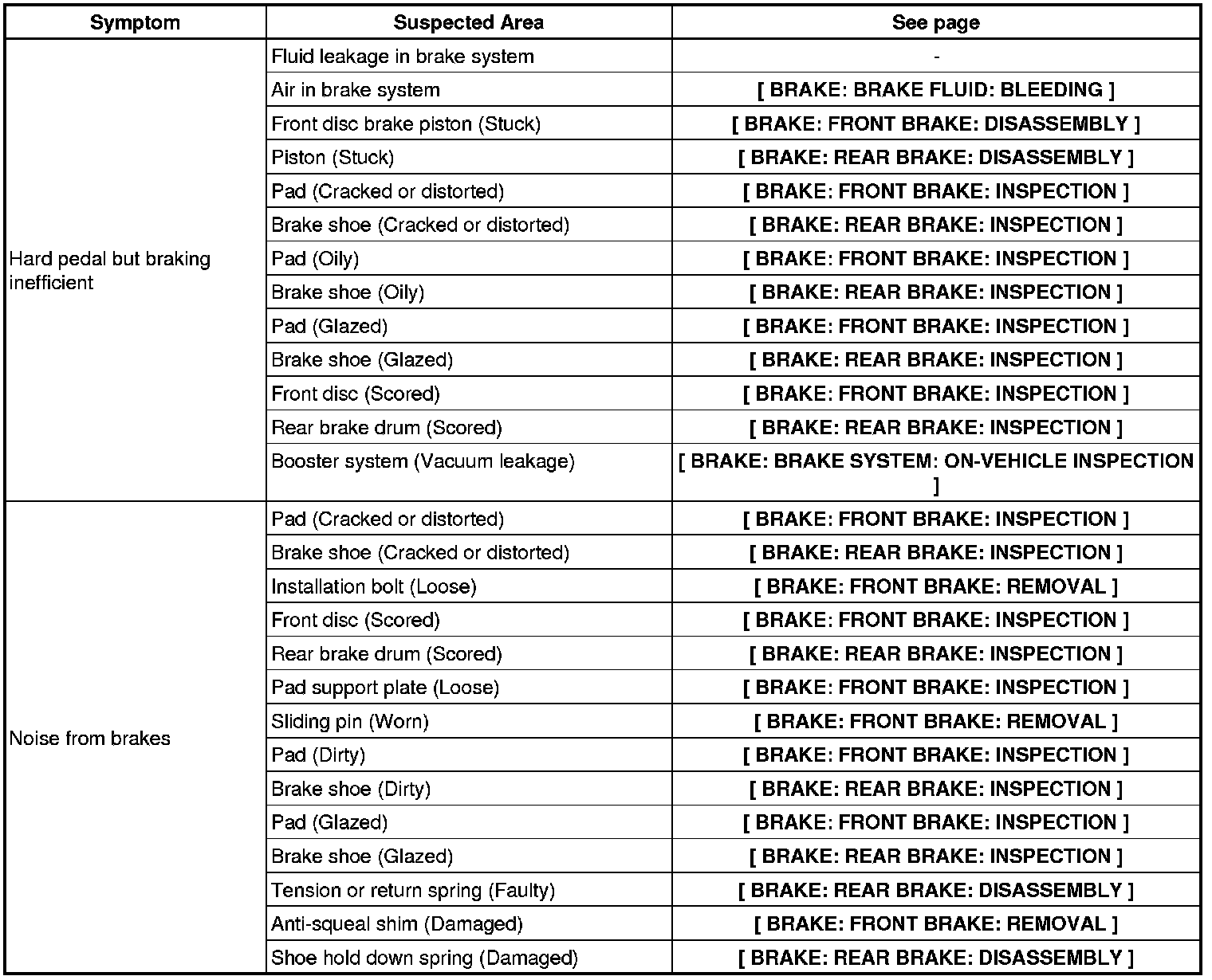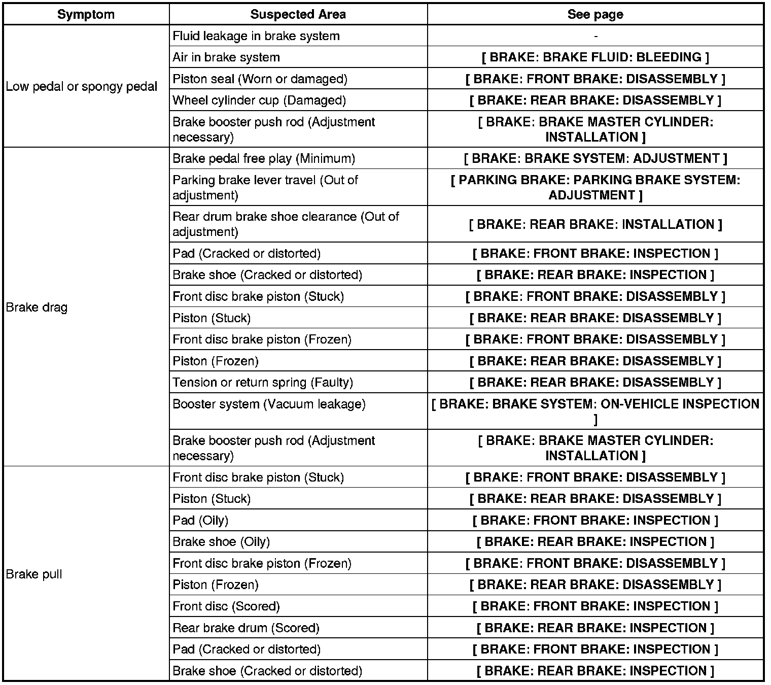BRAKE: BRAKE SYSTEM: PROBLEM SYMPTOMS TABLE