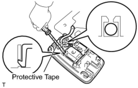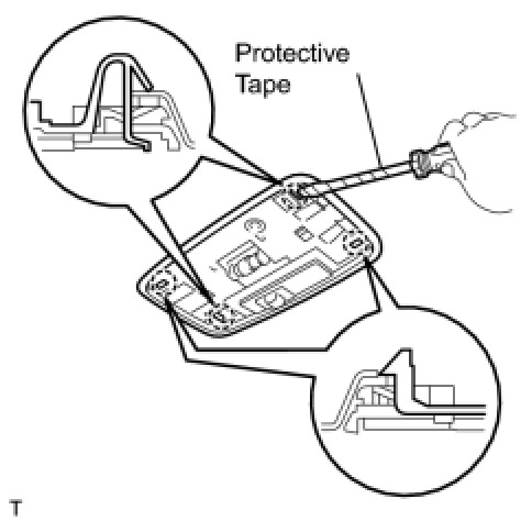 (b) Using a screwdriver with its tip wrapped in protective tape, disengage the 4 claws and remove the 2 covers.