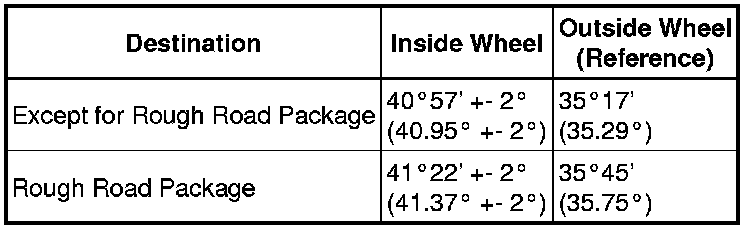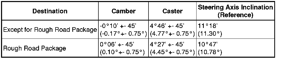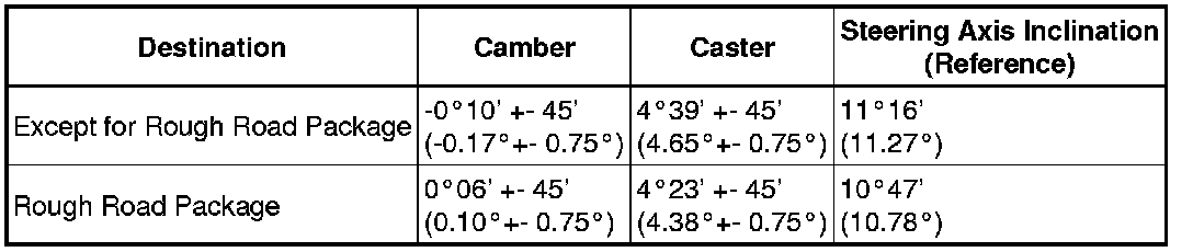 * The tolerance for the difference between the left and right wheels is 30' (0.5°) or less for both the camber and caster.
