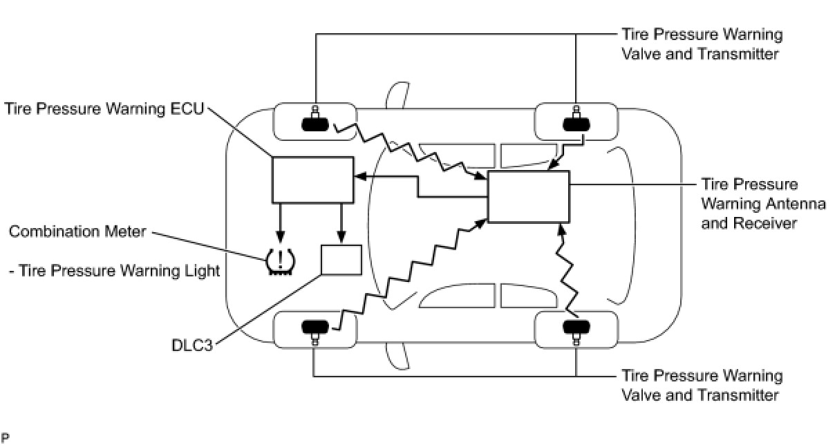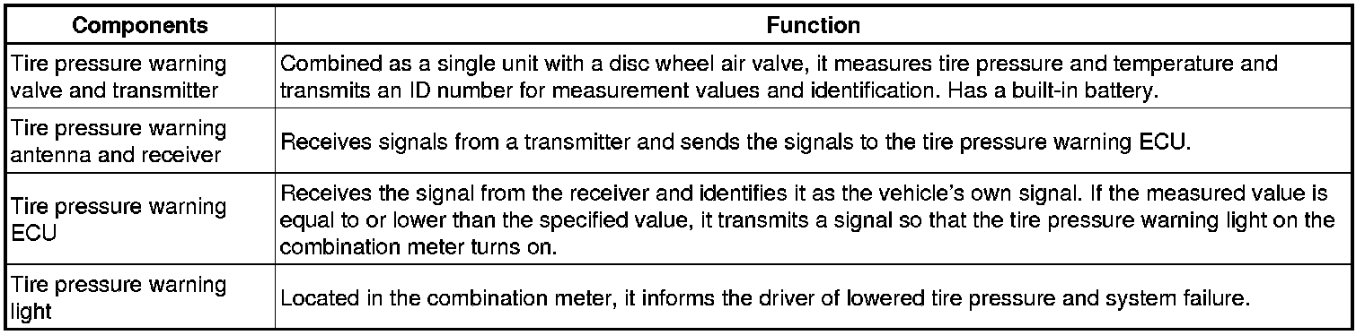 (a) Each tire pressure warning valve and transmitter is equipped with a tire pressure sensor and a transmitter and is installed in each tire wheel. The sensor measures the tire pressure. The measured value and transmitter ID are transmitted to the tire pressure warning antenna and receiver on the body as radio waves and then sent to the tire pressure warning ECU from the tire pressure warning antenna and receiver. If the transmitter ID has already been registered, the ECU compares the measured air pressure value with the standard value. When the value is less than the standard value registered in the tire pressure warning ECU, the warning light on the combination meter turns on.