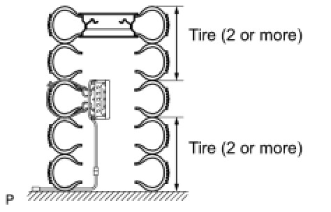 (2) Place at least 2 tires over the tire to which the front passenger airbag is tied. The disc wheel should be installed onto the top tire.