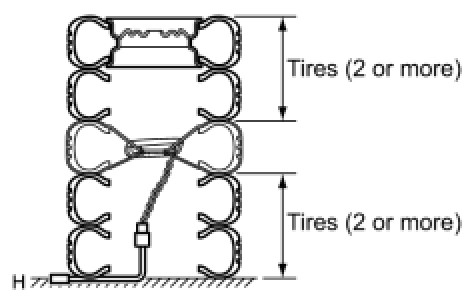 (2) Place at least 2 tires over the tire to which the front seat side airbag is tied. The disc wheel should be installed onto the top tire.