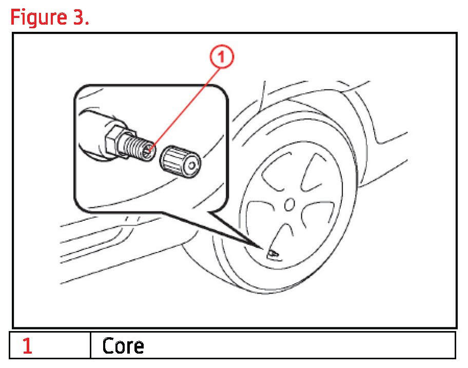 3. Press or remove the valve core to reduce the tire inflation pressure rapidly by 6 psi (0.4kgf/cm2, 40kPa), or more, within 30 seconds.