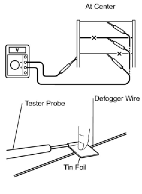 If the defogger wire is not broken, the voltmeter should indicate 0 V at the positive (+) end of the defogger wire but the indicated voltage gradually increases to approximately 12 V as the meter probe moves toward the other end.