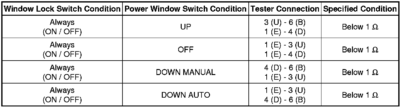 (1) If the result is not as specified, replace the power window regulator master switch.