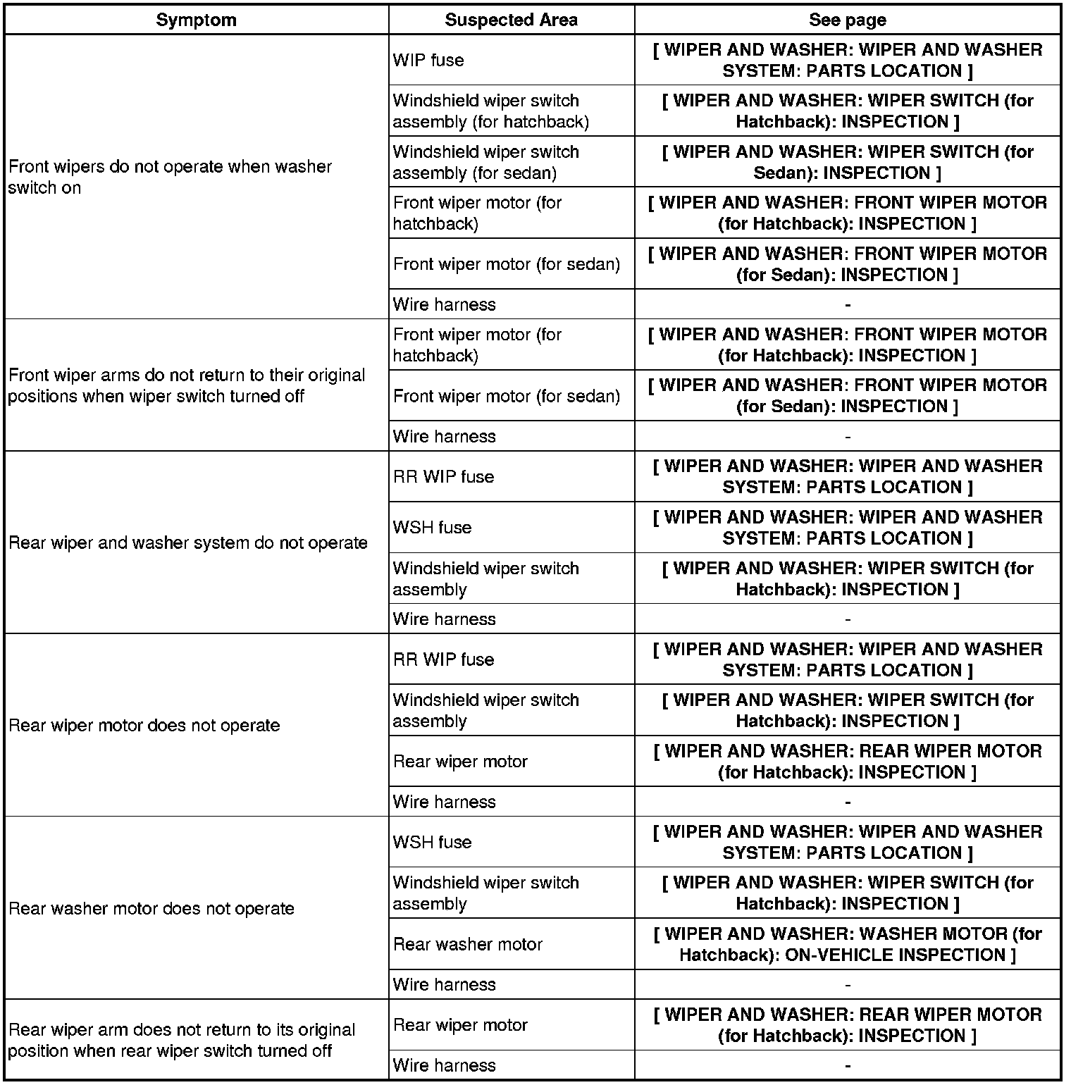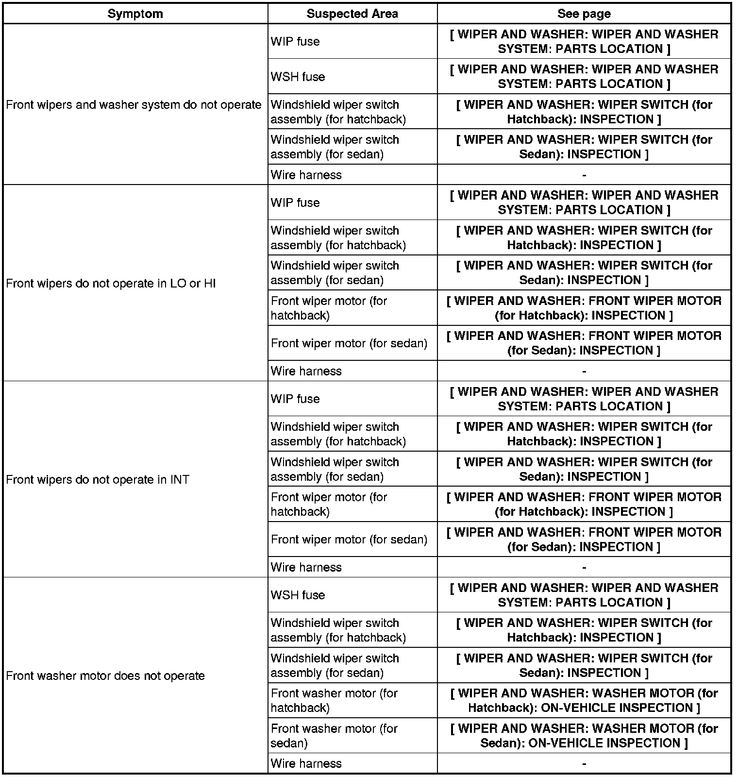 WIPER AND WASHER: WIPER AND WASHER SYSTEM: PROBLEM SYMPTOMS TABLE