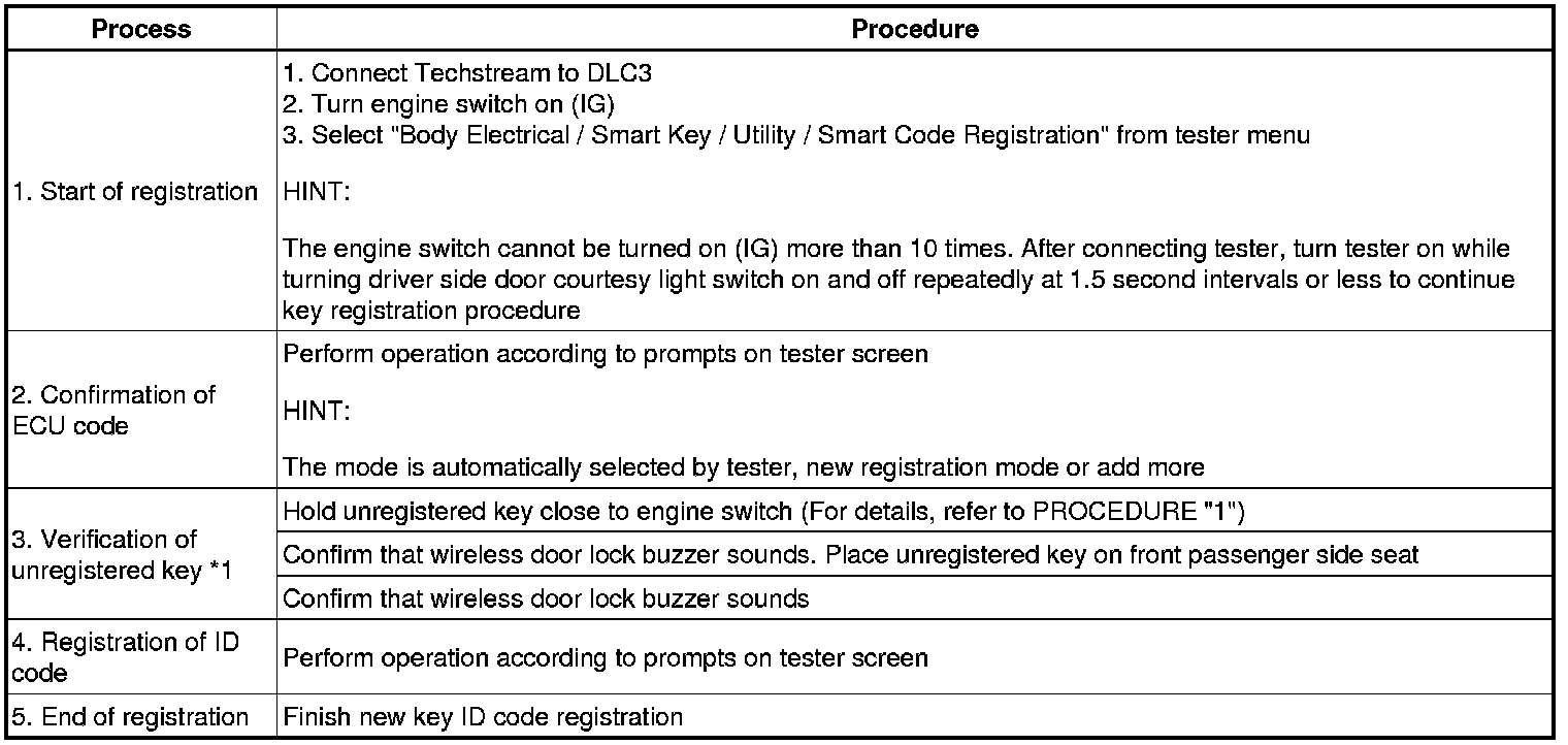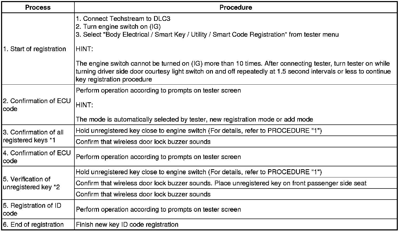 *1: Perform this process for one of the keys registered for the vehicle. Finish the procedure within 30 seconds. If the procedure has not been finished within the specified time, perform registration procedures from process 1 again.