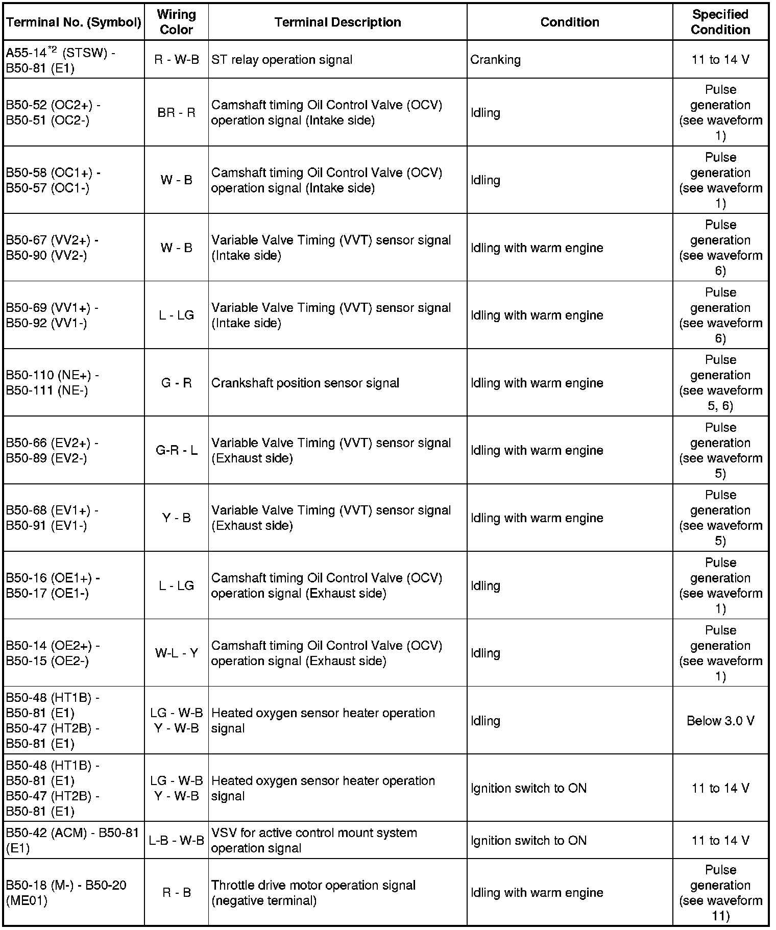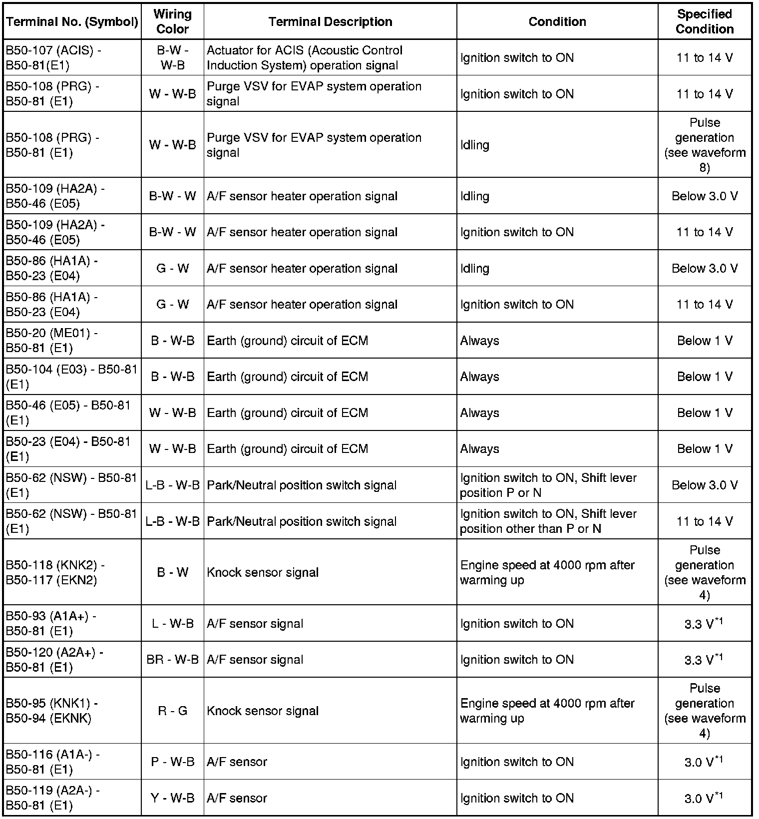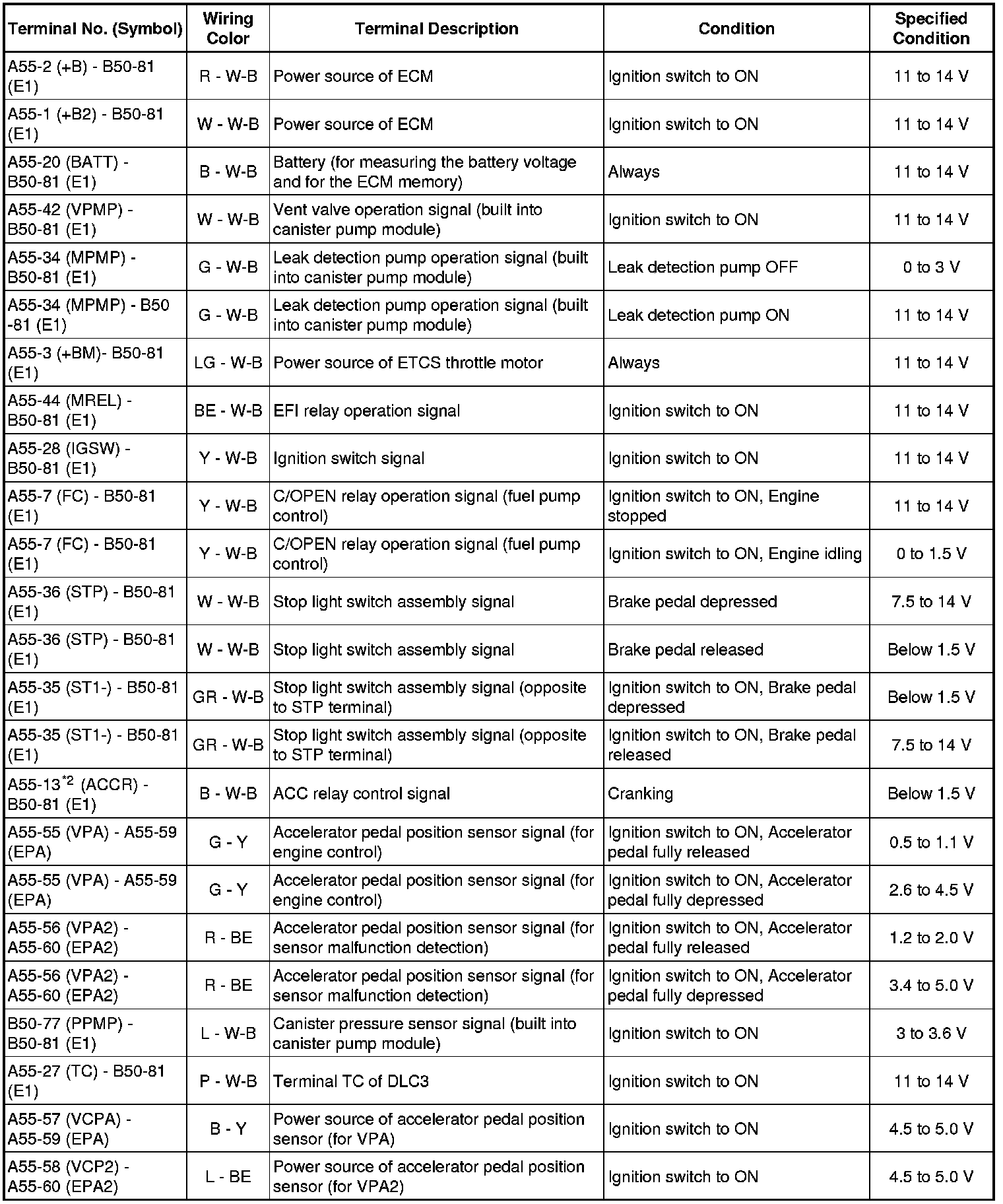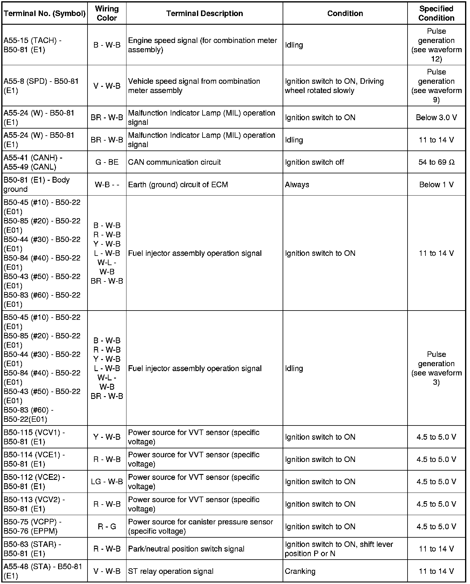 The standard normal voltage between each pair of the ECM terminals is shown in the table below. The appropriate conditions for checking each pair of the terminals are also indicated.