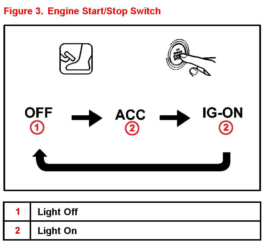 (2) Without depressing the brake pedal, press the "ENGINE START/STOP" switch and confirm the mode changes properly. From the "OFF" mode: