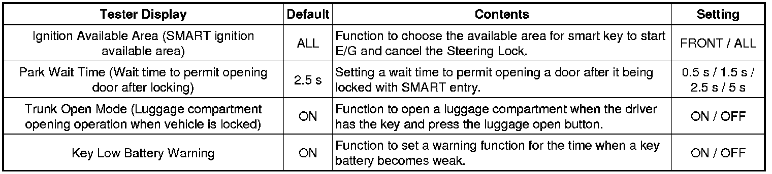 * The function only switches the entry unlock of the smart key system. It does not switch the unlocking of the wireless door lock remote control.