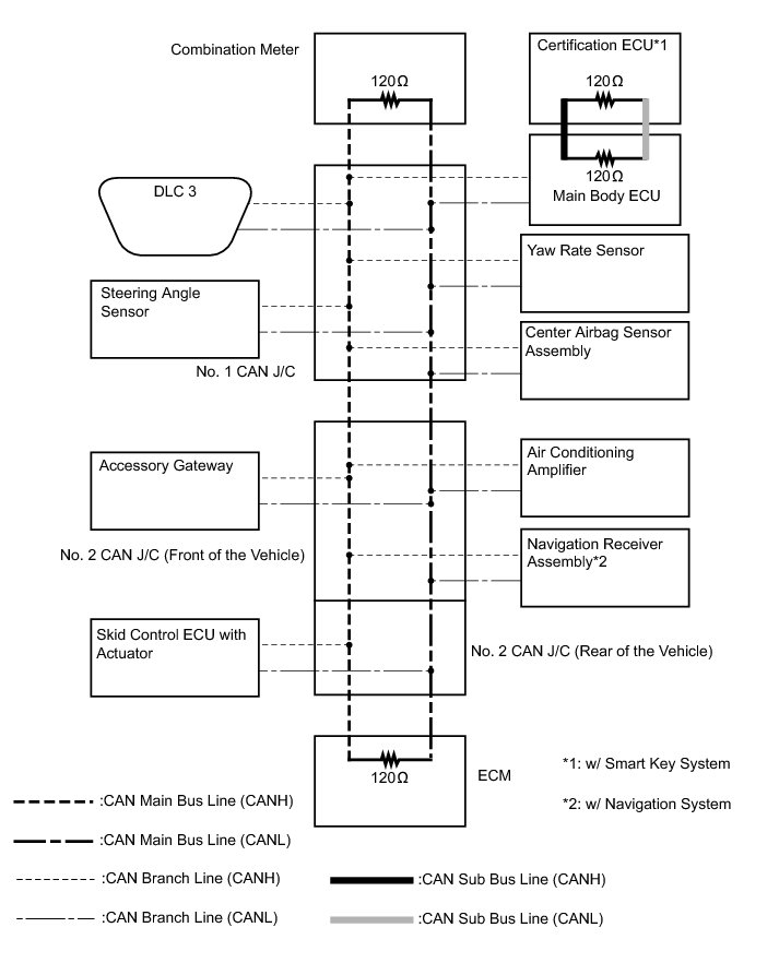 (1) Two resistors of 120 Ohms resistance are installed in parallel across the ends of the CAN main bus wires. They are called terminating resistors. These resistors allow the changes of the voltage differential between the CAN bus wires to be accurately judged. To allow proper function of CAN communication, it is necessary to have both terminating resistors installed. Since the two resistors are installed in parallel, a measurement of resistance between the two CAN bus wires should produce a reading of approximately 60 Ohms.