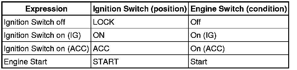 The type of ignition switch used on this model differs according to the specifications of the vehicle. The expressions listed in the table below are used in this section.