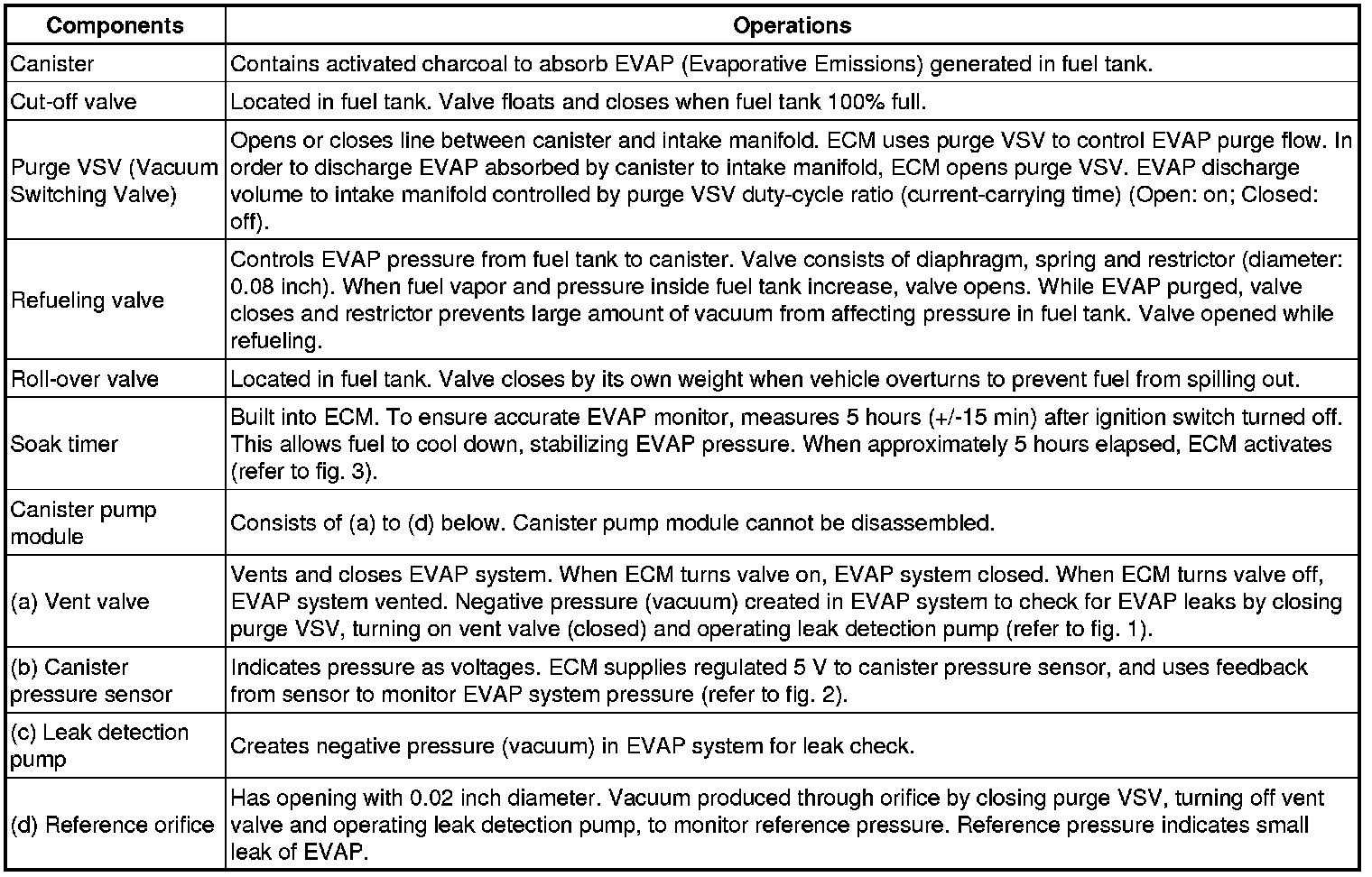 The leak detection pump creates negative pressure (vacuum) in the EVAP system and the pressure is measured. Finally, the ECM monitors for leaks from the EVAP system, and malfunctions in both the canister pump module and purge VSV, based on the EVAP pressure.