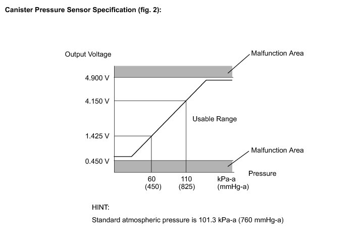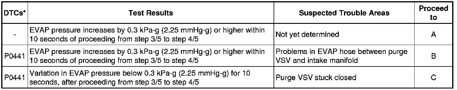 * The vent valve is turned off (open) and the EVAP pressure is measured. If the variation in the pressure is below 0.5 kPa-g (3.75 mmHg-g), the ECM interprets this as the purge VSV being stuck closed, illuminates the MIL and stores DTC P0441 (2 trip detection logic).