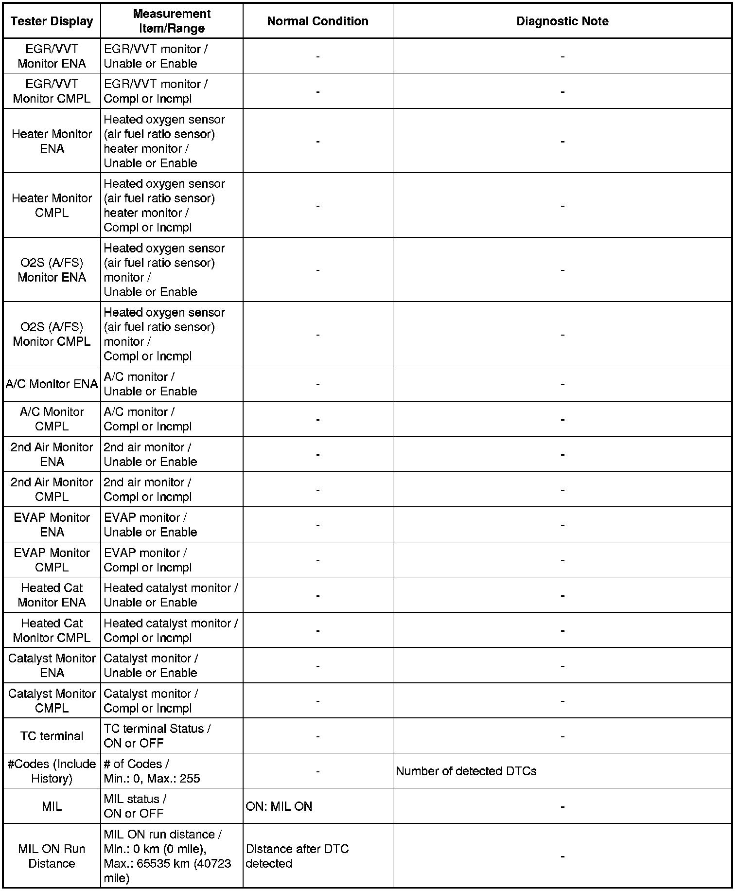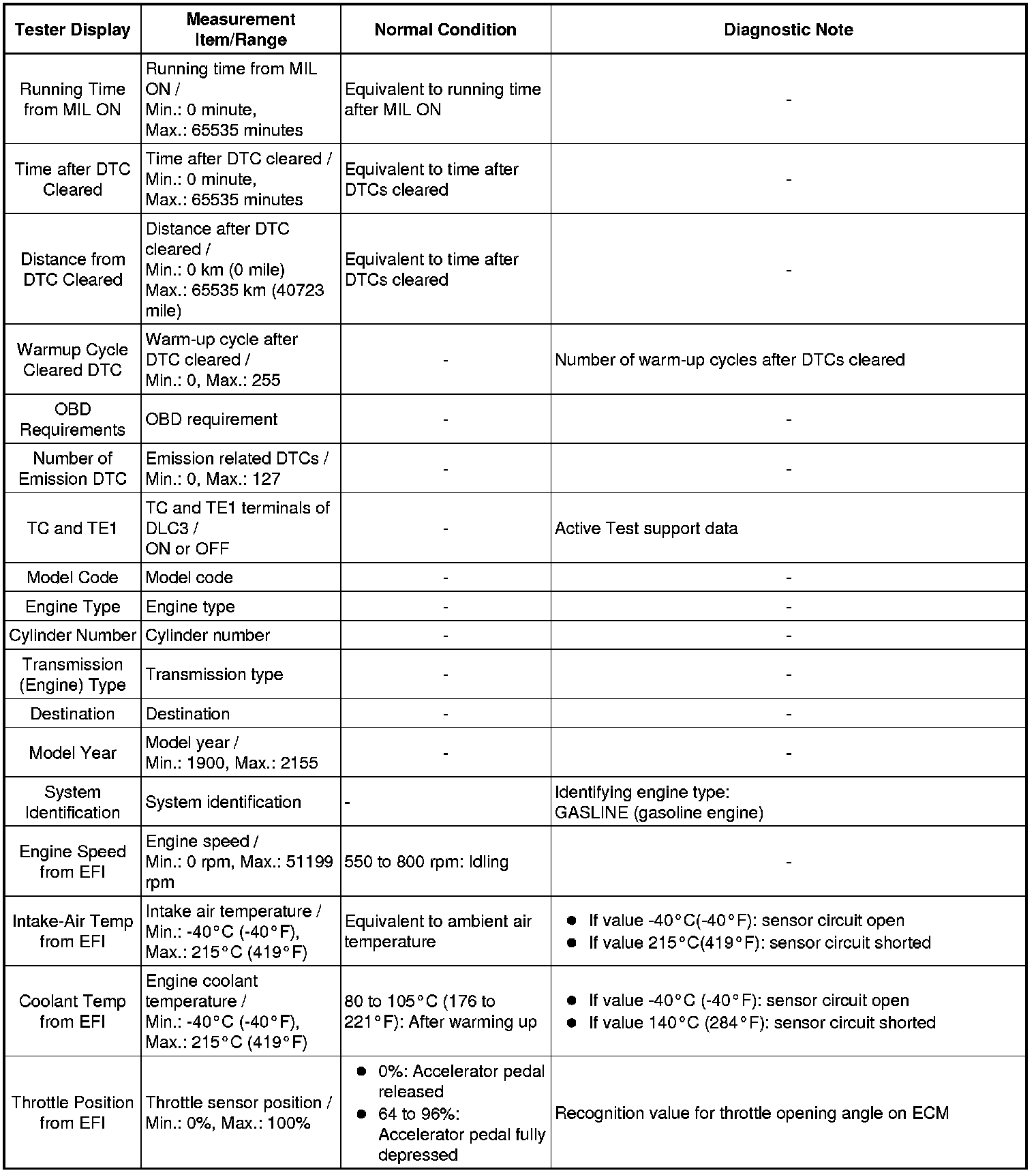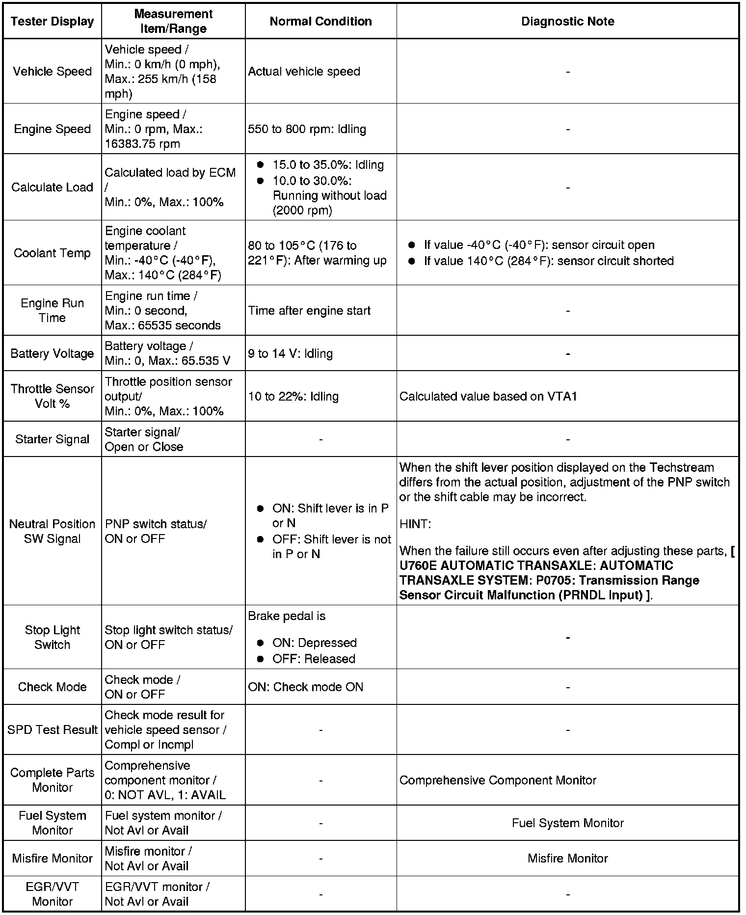 Using the Techstream to read the Data List allows the values or states of switches, sensors, actuators and other items to be read without removing any parts. This non-intrusive inspection can be very useful because intermittent conditions or signals may be discovered before parts or wiring is disturbed. Reading the Data List information early in troubleshooting is one way to save diagnostic time.
