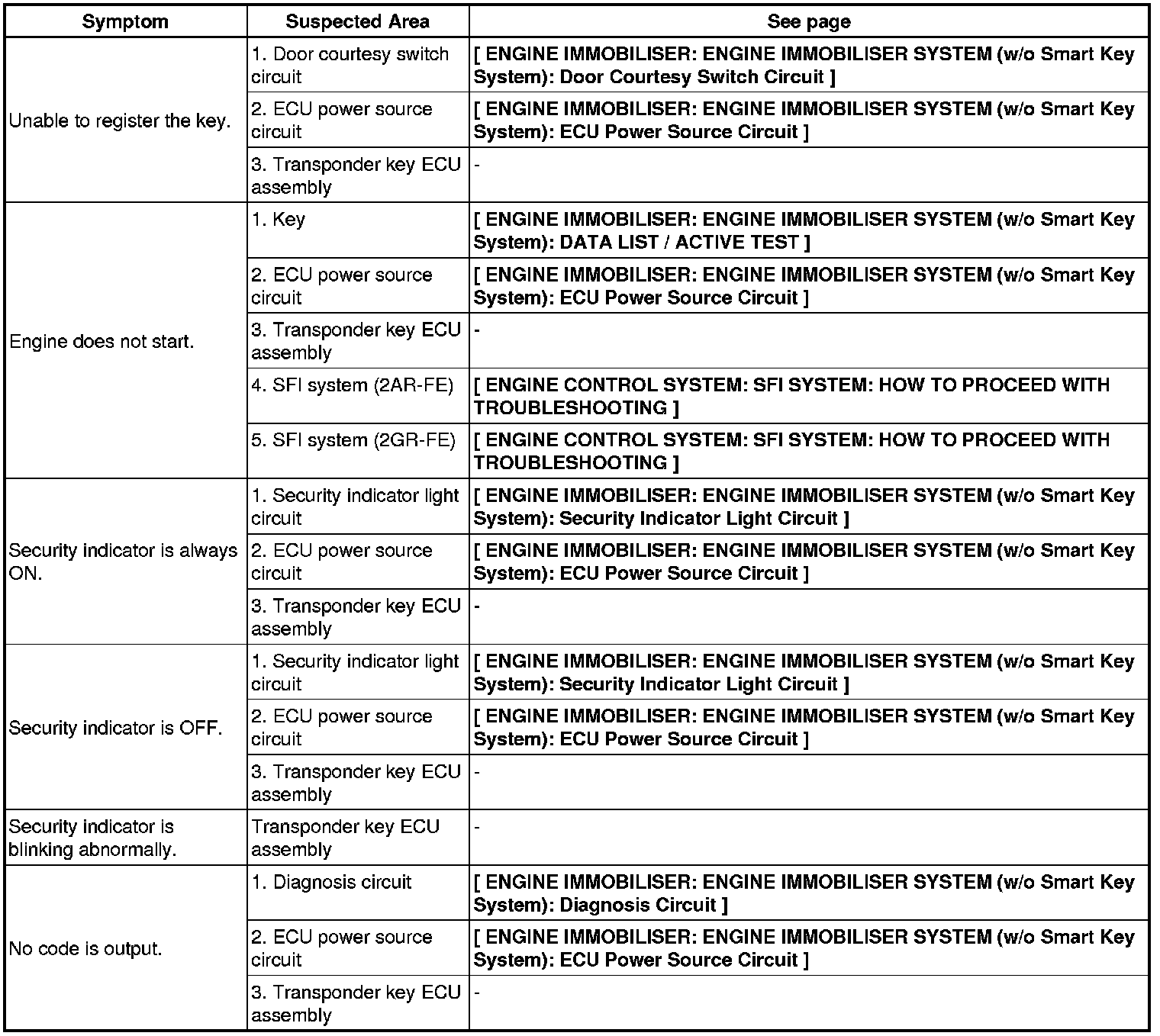 ENGINE IMMOBILISER: ENGINE IMMOBILISER SYSTEM (w/o Smart Key System): PROBLEM SYMPTOMS TABLE
