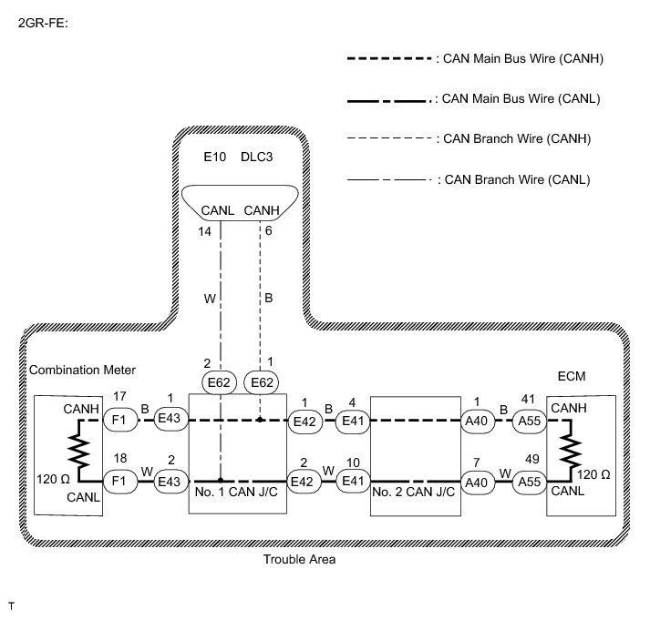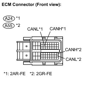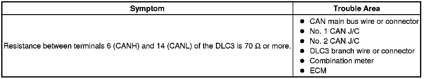There may be an open circuit in the CAN main bus wire and/or the DLC3 branch wire when the resistance between terminals 6 (CANH) and 14 (CANL) of the DLC3 is 70 Ohms or more.