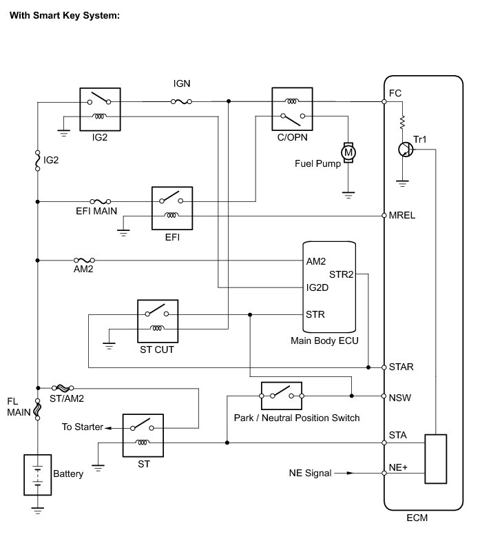 When the STA signal and NE signal are input to the ECM, Tr1 is turned ON, current flows to coil of the circuit opening relay (Marking: C/OPN), the relay switches on, power is supplied to the fuel pump and the fuel pump operates.