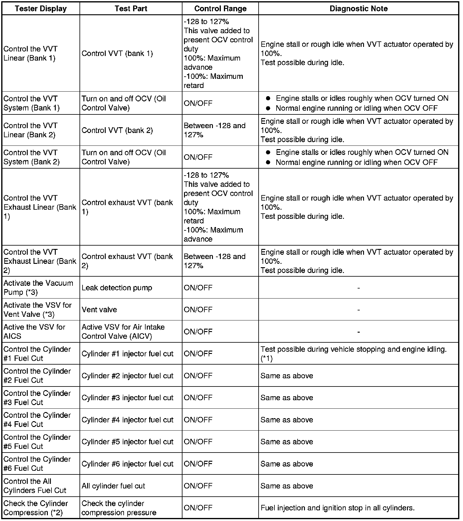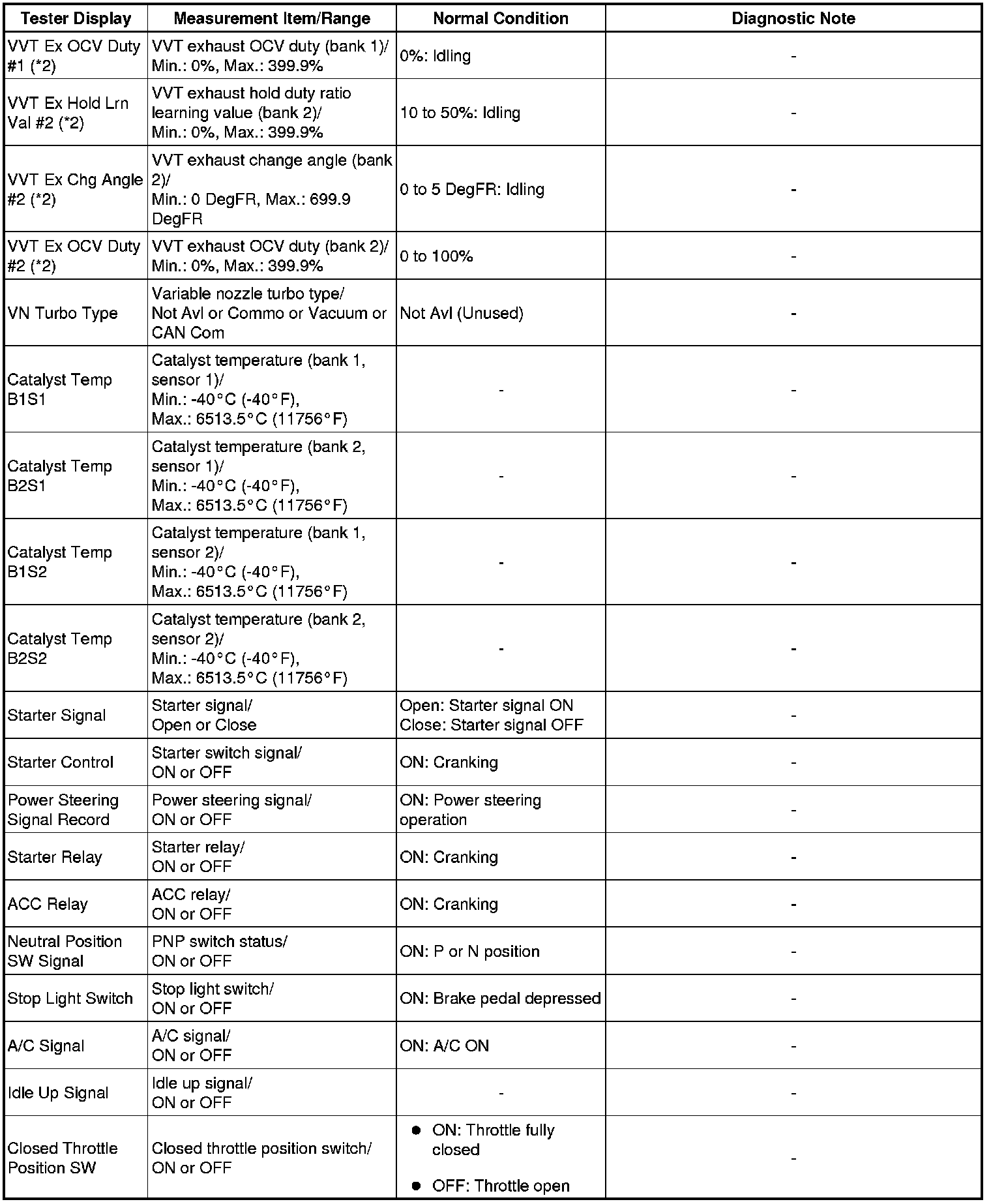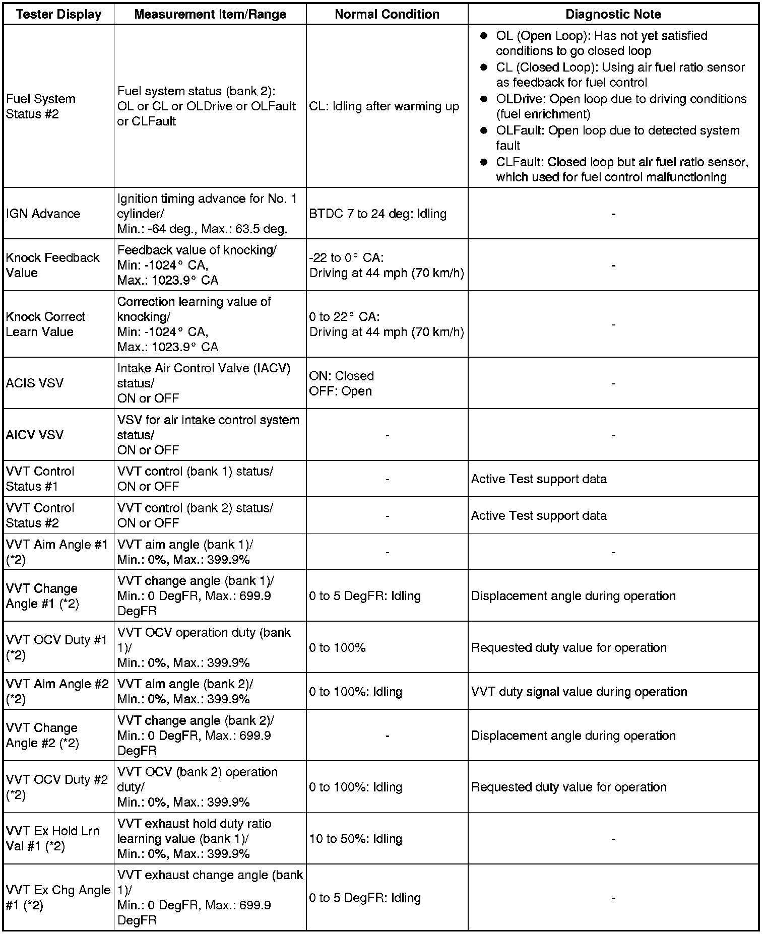 * *2: Data List values are displayed only when performing the following Active Test: Control the VVT Linear (Bank 1 or Bank 2) or Control the VVT Exhaust Linear (Bank 1 or Bank 2). For other Active Test, the Data List value will be 0.
