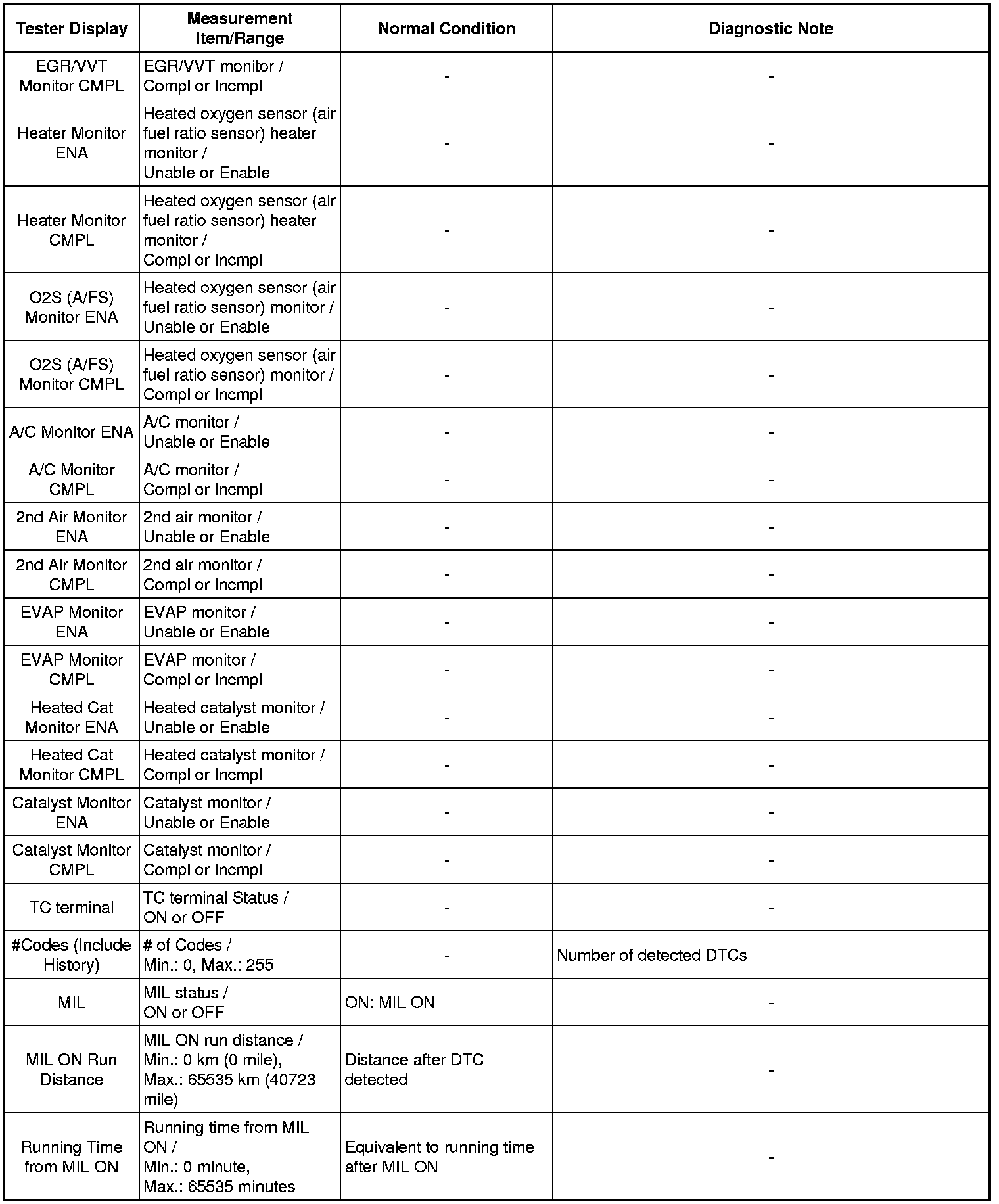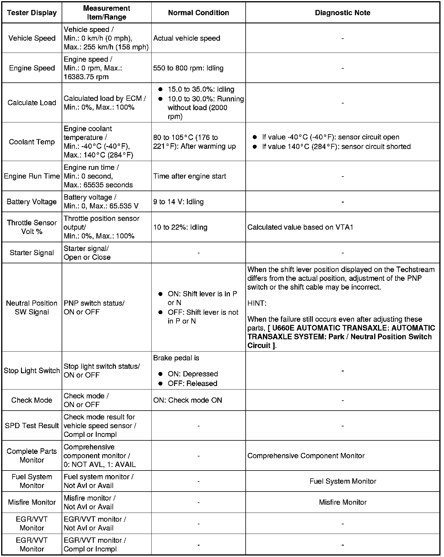 Using Techstream to read the Data List allows the values or states of switches, sensors, actuators and other items to be read without removing any parts. This non-intrusive inspection can be very useful because intermittent conditions or signals may be discovered before parts or wiring is disturbed. Reading the Data List information early in troubleshooting is one way to save diagnostic time.