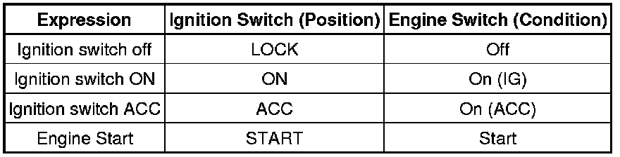 The type of ignition switch used on this model differs according to the specifications of the vehicle. The expressions listed in the table below are used in this section.