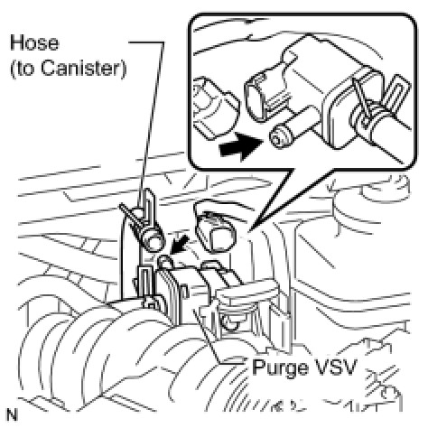 (a) Disconnect the hose (connected to the intake manifold) from the purge VSV.