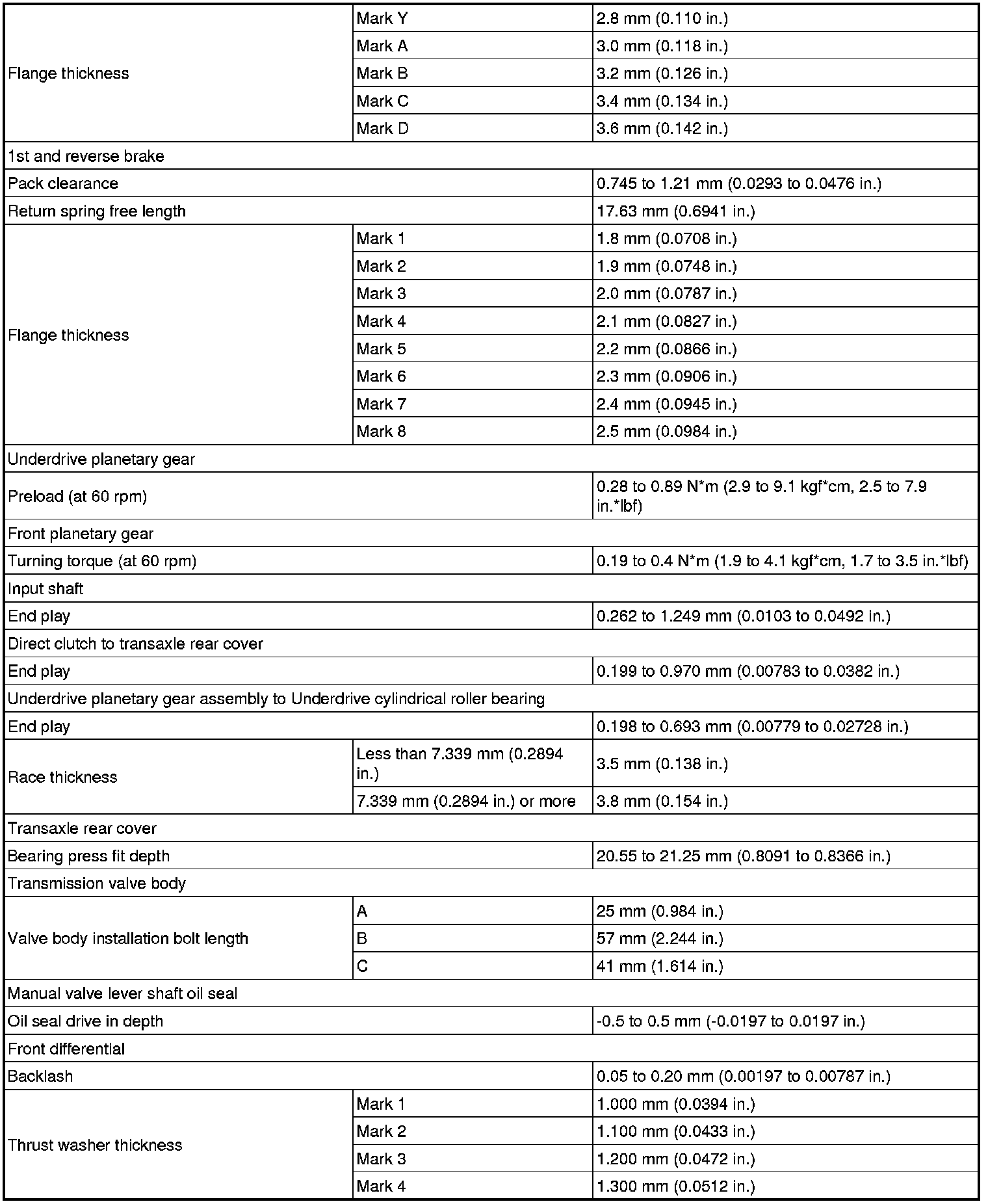 SPECIFICATIONS: U250E AUTOMATIC TRANSMISSION / TRANSAXLE: SERVICE DATA