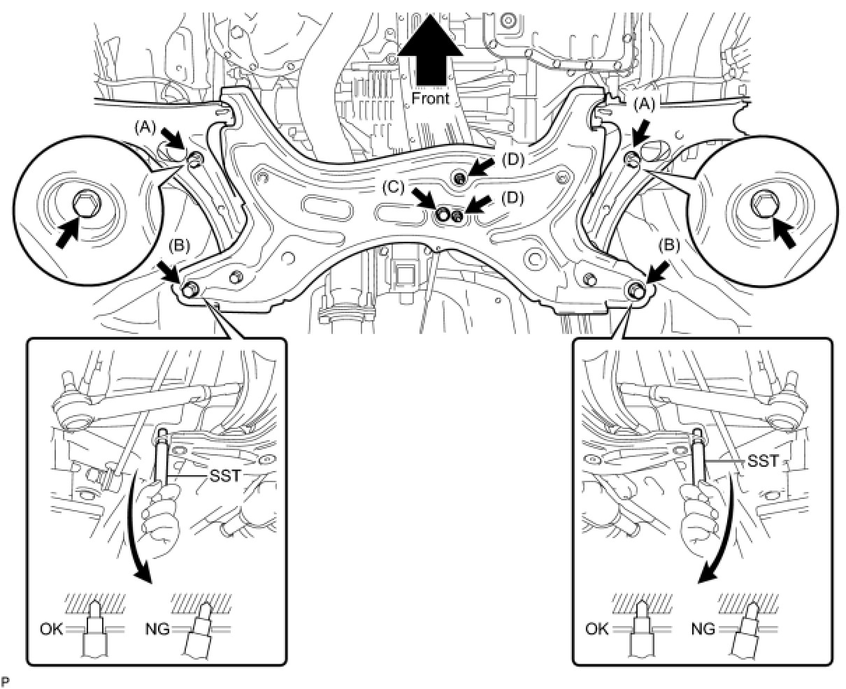 (a) While alternately inserting SST into the reference holes on the front suspension crossmember RH and LH, tighten the 2 bolts (A), 2 bolts (B), bolt (C), and 2 nuts (D) on the RH and LH sides to the respective specified torque in several steps.