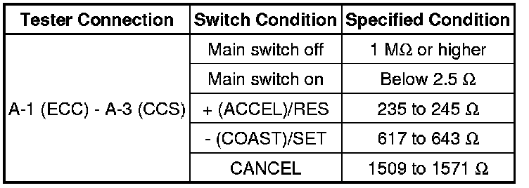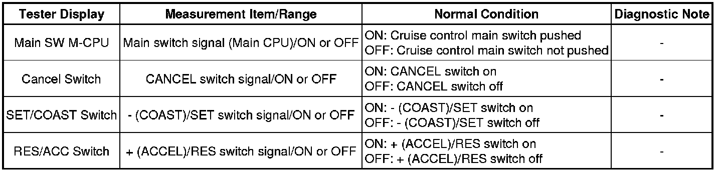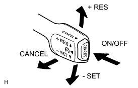 The cruise control main switch operates 7 functions: SET, - (COAST), TAP-DOWN, RES (RESUME), + (ACCEL), TAP-UP, and CANCEL. The SET, TAP-DOWN, and - (COAST) functions, and the RES (RESUME), TAP-UP, and + (ACCEL) functions are operated with the same switch. The cruise control main switch is an automatic return type switch which turns on only while operating it in each direction and turns off after releasing it. The internal contact point of the cruise control main switch is turned on with the switch operation. Then the ECM reads the voltage value that has been changed by the switch operation to control SET, - (COAST), RES (RESUME), + (ACCEL), and CANCEL.