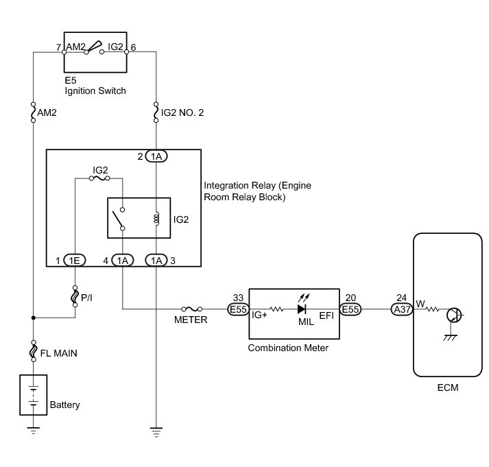 The MIL (Malfunction Indicator Lamp) is used to indicate vehicle malfunction detections by the ECM. When the ignition switch is turned to ON, power is supplied to the MIL circuit, and the ECM provides the circuit ground which illuminates the MIL.
