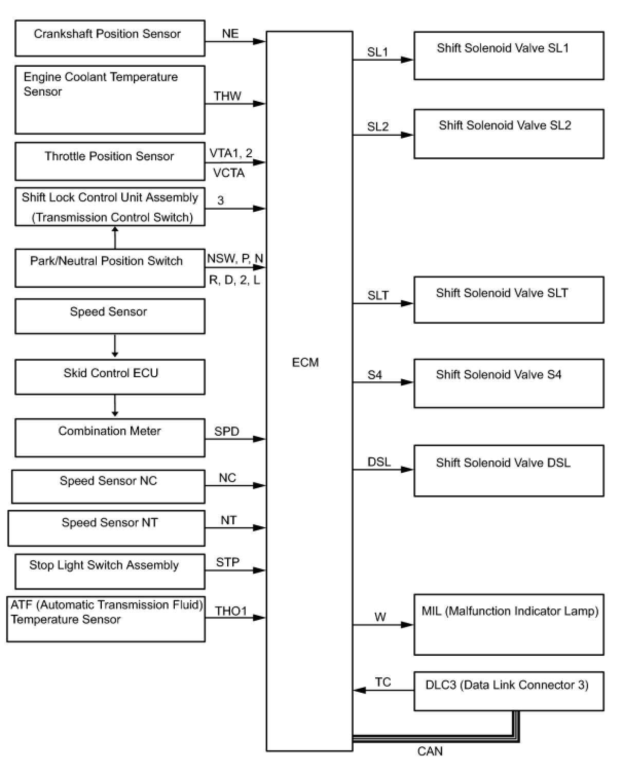 The configuration of the electronic control system in the U140F automatic transaxle is as shown in the following chart.