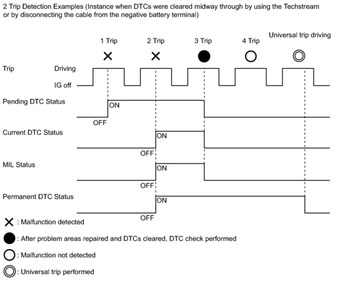 * After clearing current DTCs using the Techstream (or by disconnecting the cable from the negative battery terminal), permanent DTCs can be cleared when the system is determined to be normal for the relevant DTCs and then the universal trip is performed.